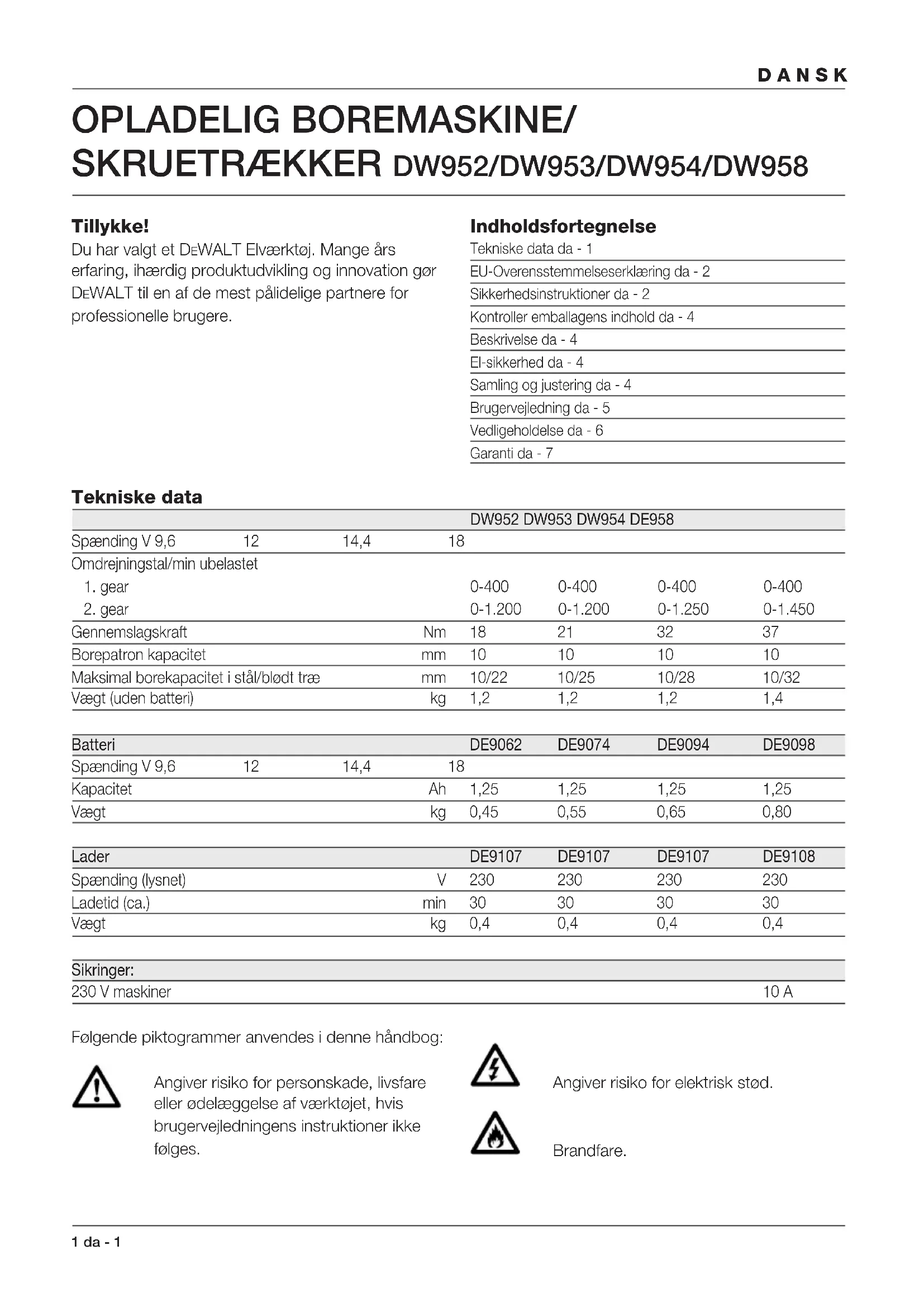 Gennemslagskraft Nm 18 21 32 37 Borepatron kapacitet mm 10 10 10 10 Maksimal borekapacitet i stål/blødt træ mm 10/22 10/25 10/28 10/32 Vægt (uden batteri) kg 1,2 1,2 1,2 1,4 Batteri DE9062 DE9074 DE9094 DE9098 Spænding V 9,6 12 14,4 18 Kapacitet Ah 1,25 1,25 1,25 1,25 Vægt kg 0,45 0,55 0,65 0,80 Lader DE9107 DE9107 DE9107 DE9108 Spænding (lysnet) V 230 230 230 230 Ladetid (ca.) min 30 30 30 30 Vægt kg 0,4 0,4 0,4 0,4 Sikringer: 230 V maskiner 10 A Følgende piktogrammer anvendes i denne håndbog: Angiver risiko for personskade, livsfare eller ødelæggelse af værktøjet, hvis brugervejledningens instruktioner ikke følges. Angiver risiko for elektrisk stød. Brandfare.da - 2 2 DANSK EU-Overensstemmelseserklæring DW952/DW953/DW954/DW958 DEWALT erklærer at disse værktøjer er konstrueret i henhold til EU-direktiverne: 89/392/EØF, 89/336/EØF, 73/23/EØF, EN 50144, EN 55104 / EN 55014-2, EN 55014, EN 61000-3-2 & EN 61000-3-3. For yderligere information bedes De venligst kontakte DEWALT på nedenstående adresse eller se bagsiden af brugervejledningen. Lydniveauet er i overensstemmelse med EU-direktiverne 86/188/EØF & 89/392/EØF, målt i henhold til EN 50144: DW952 DW953 DW954 DW958