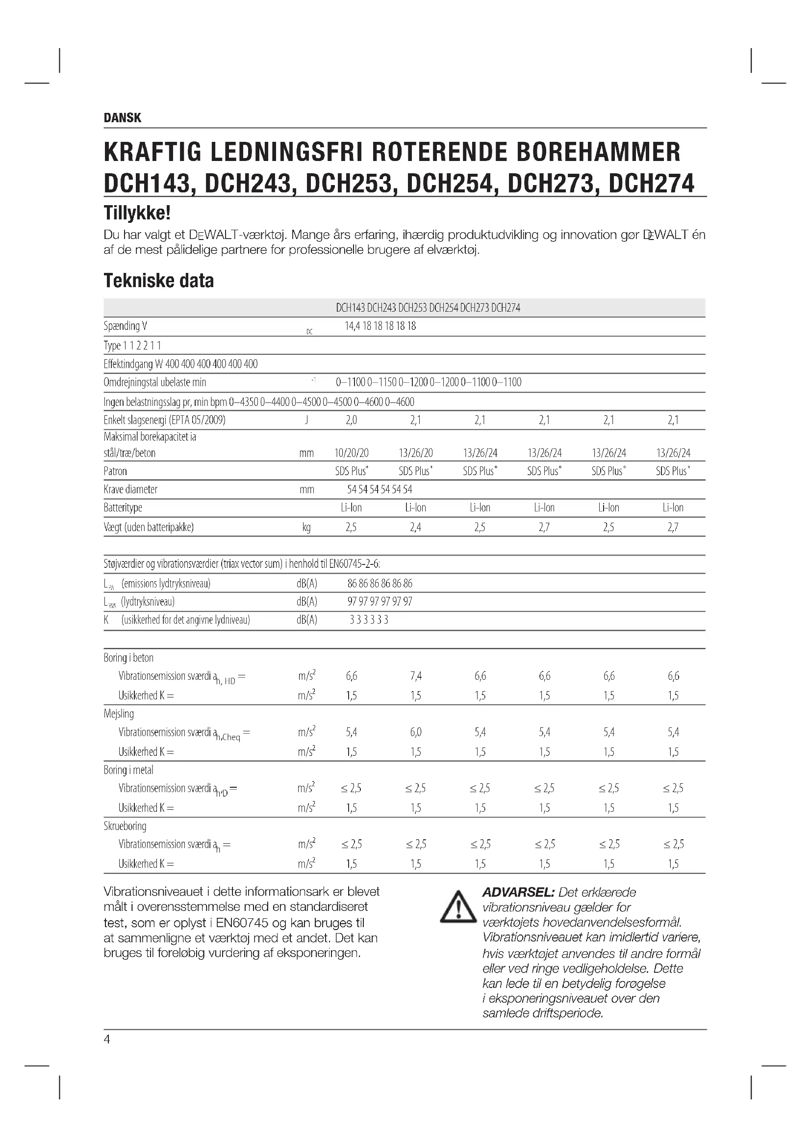 WALT batteripakke være undtaget fra at blive klassificeret som et fuldt reguleret klasse 9 farligt materiale. Generelt de to tilfælde, der kræver afsende i klasse 9 er:12 Dansk Pakkens indhold Pakken indeholder: 1 Ledningsfri roterende borehammer 1 Sidehåndtag og dybdestang 1 Oplader 1 Batteripakke (D1, L1, M1, P1) 2 Batteripakker (D2, L2, M2, P2) 3 Batteripakker (D3, L3, M3, P3) 1 Patron uden nøgle (DCH254, DCH274) 1 Kit box 1 Brugsvejledning BEMÆRK: Batteripakker, opladere og værktøjskasser er ikke inkluderede i N-modeller.