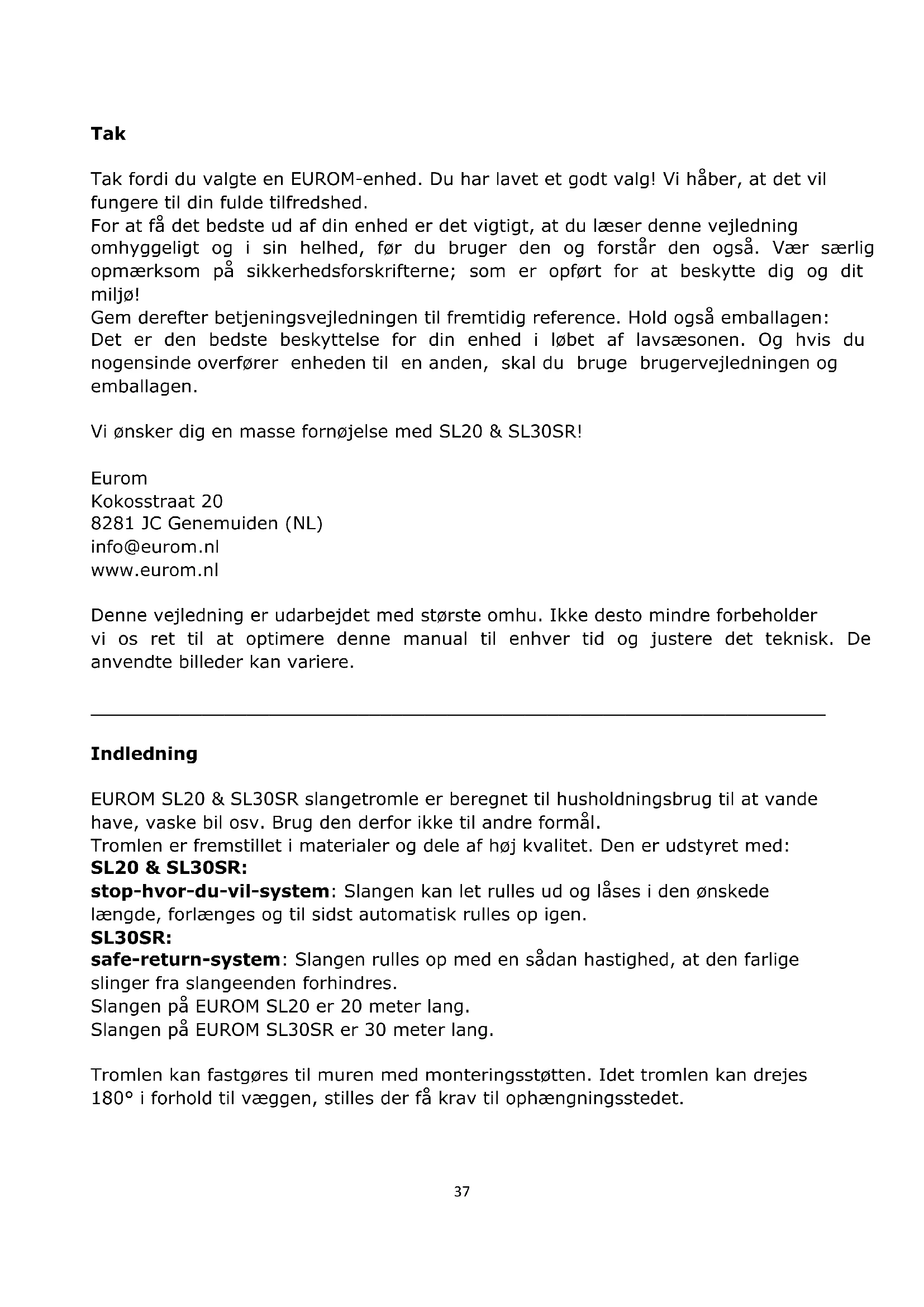 Anvendelse Op- og afrulning af slangen Denne tromle er udstyret med et særligt stop-hvor-du-vil-system. Træk slangen ud i ønsket længde; når du stopper med at trække, låses slangen automatisk. Ved efterfølgende at give slangen et ryk, begynder automatic-return-systemet automatisk at rulle slangen op. Oprulning kan afbrydes ved igen at trække i slangen. Hold altid sprøjtehovedet i hånden under oprulning (så den ikke kan slingre rundt), og før slangen med den anden hånd. SL30SR er endvidere udstyret med et safe-return-system, som sørger for, at slangen oprulles roligt (og dermed sikkert). Hvis slangen vrides, skal du trække den ud i fuld længde, fjerne vridningerne og lade slangen rulle jævnt tilbage på tromlen. Funktion Slut vandindtagsslangen til vandhanen. Når du åbner for vandhanen, løbet vandet gennem slangen til sprøjtehovedet, og du kan nu sprøjte vand med slangen. Sørg for, at sprøjtehovedet er åbent. Du kan regulere strålen ved at dreje enden af sprøjtehovedet. Hvis ønsket kan der tilføjes et andet sprøjtehoved eller endnu en slange til hurtigkoblingen mellem slange og sprøjtehoved. Forlængelse af slangen medfører dog tab i vandtryk.40 Luk altid vandhanen efter brug, og åbn sprøjtehovedet for at fjerne vandtrykket. Bemærk! Led ikke kemikalier eller faste stoffer gennem slangen, og lad ikke ydersiden komme i kontakt med aggressive stoffer eller skarpe genstande; det kan beskadige slangen. Lad altid resterende vand løber ud af slangen efter brug, og rul slangen op på tromlen. Slangen kan beskadiges indvendigt af solopvarmet vand og/eller højt vandtryk. Ved meget lave temperaturer er slangen mindre fleksibel. Sørg for, at tilbageværende vand i slangen ikke kan fryse. Sæt tromlen indenfor ved frost! Denne slangetromle er ikke egnet til at lede drikkevand. Rengøring og vedligeholdelse Hvis slangen er snavset, skal den aftørres med en (evt. fugtig) klud, inden den rulles op på tromlen. Sørg dog for, at slangen er tør, inden den rulles op, så der ikke kommer fugt i tromlen. Huset kan også rengøres med en fugtig klud. Brug ikke aggressive rengøringsmidler eller kemikalier, da det vil beskadige materialet! Sænk ikke (dele af) tromlen ned i vand! Montering af tromlen på et overdækket sted forlænger levetiden. Når den eksponeres for regn og sollys, udsættes både metal- og plastdele samt viklingsmekanismen for erosion, hvilket påvirker levetiden. Eksponer aldrig tromlen for frost, særligt ikke, når der stadig kan være vand i slangen! Når du ikke bruger slangetromlen, tilrådes det at opbevare den indendørs, især uden for sæsonen. Hvis slangen efter tid bliver svær at rulle op, er fjederen muligvis blevet slap, og spændingen skal justeres. Henvend dig for dette til dit servicepunkt. Tromlen indeholder ingen dele indvendigt, som du selv må justere. Henvend dig til din leverandør eller servicepunkt ved forstyrrelser. Åbn aldrig selv huset! Fjernelse Inden for EU betyder dette symbol, at dette produkt ikke må smides væk med det normale husholdningsaffald. Kasserede apparater indeholder værdifulde materialer, der kan og bør genbruges for ikke at skade miljø og helbred med ureguleret affaldsindsamling. Bring derfor kasseret apparatur til dertil angivne indsamlingssteder eller henvend dig til den virksomhed, hvor du købte apparatet. De kan sørge for, at så mange dele af apparatet som muligt genbruges.41 CE-erklæring Herved erklærer Eurom – Kokosstraat 20 – 8281 JC - Genemuiden-NL, at EUROM- slangetromlen, type SL20 & SL30SR, overholder og er i overensstemmelse med følgende retningslinjer og standarder: Maskindirektiv 2006/42/EC EN ISO 12100:2010