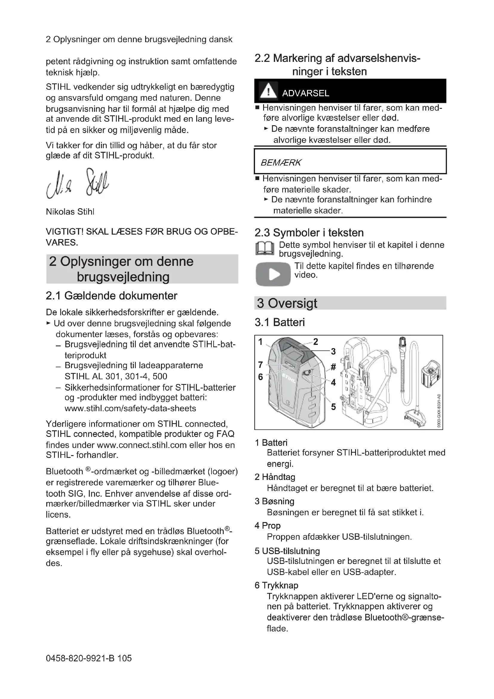0000-GXX-8331-A0 1 Batteri Batteriet forsyner STIHL-batteriproduktet med energi. 2 Håndtag Håndtaget er beregnet til at bære batteriet. 3 Bøsning Bøsningen er beregnet til få sat stikket i. 4 Prop Proppen afdækker USB-tilslutningen. 5 USB-tilslutning USB-tilslutningen er beregnet til at tilslutte et USB-kabel eller en USB-adapter. 6 Trykknap Trykknappen aktiverer LED'erne og signalto‐ nen på batteriet. Trykknappen aktiverer og deaktiverer den trådløse Bluetooth®-grænse‐ flade. 2 Oplysninger om denne brugsvejledning dansk 0458-820-9921-B 1057 LED'er LED'erne viser batteriets ladetilstand, fejl samt om den trådløse Bluetooth®-grænse‐ flade er aktiveret eller deaktiveret. # Effektskilt med maskinnummer