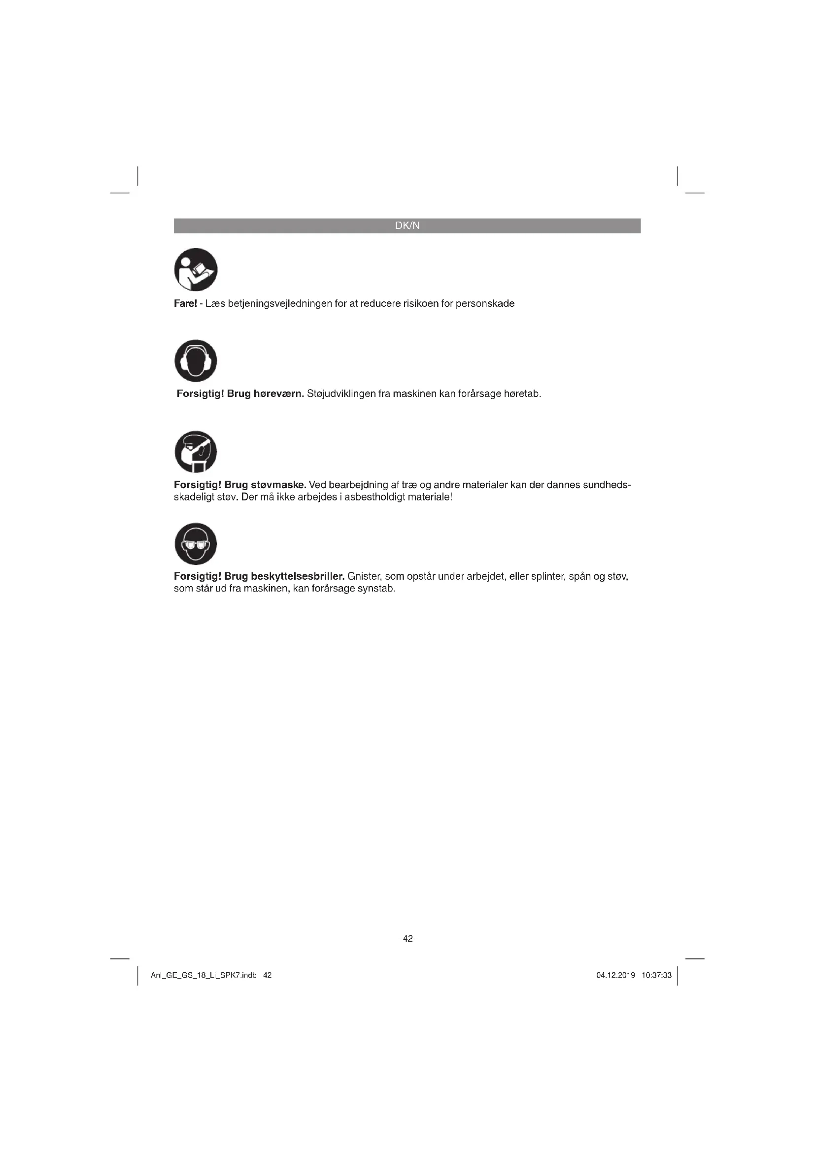 Fare! - Læs betjeningsvejledningen for at reducere risikoen for personskade Forsigtig! Brug høreværn. Støjudviklingen fra maskinen kan forårsage høretab. Forsigtig! Brug beskyttelsesbriller. Gnister, som opstår under arbejdet, eller splinter, spån og støv, som står ud fra maskinen, kan forårsage synstab. Forsigtig! Brug støvmaske. Ved bearbejdning af træ og andre materialer kan der dannes sundheds- skadeligt støv. Der må ikke arbejdes i asbestholdigt materiale! Anl_GE_GS_18_Li_SPK7.indb 42Anl_GE_GS_18_Li_SPK7.indb 42 04.12.2019 10:37:3304.12.2019 10:37:33DK/N