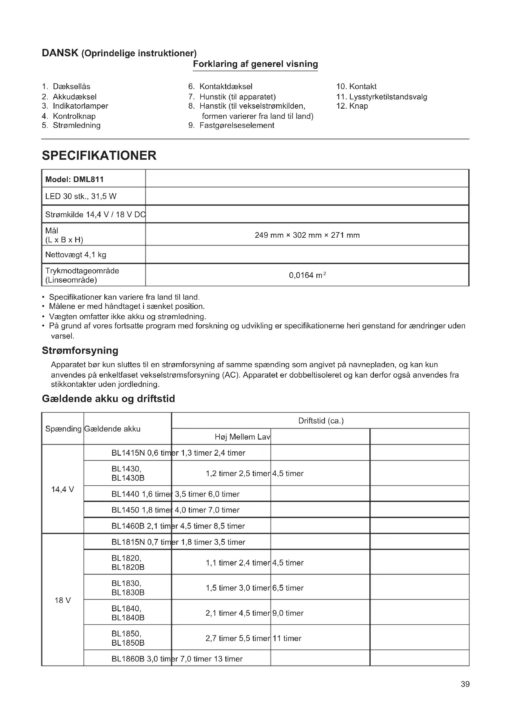 SPECIFIKATIONER Model: DML811 LED 30 stk., 31,5 W Strømkilde 14,4 V / 18 V DC Mål (L x B x H) 249 mm × 302 mm × 271 mm Nettovægt 4,1 kg Trykmodtageområde (Linseområde) 0,0164 m