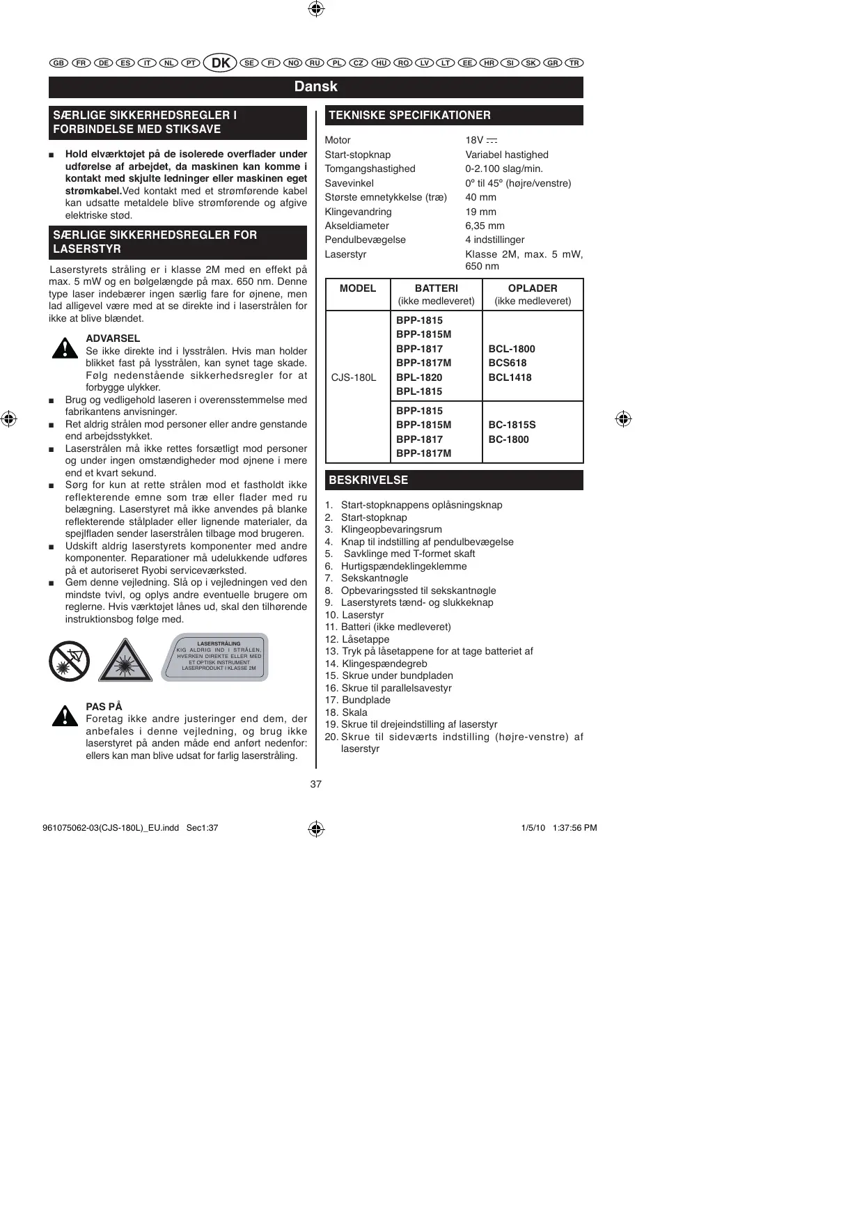 MODEL ADVARSEL Se ikke direkte ind i lysstrålen. Hvis man holder blikket fast på lysstrålen, kan synet tage skade. Følg nedenstående sikkerhedsregler for at forbygge ulykker. Brug og vedligehold laseren i overensstemmelse med fabrikantens anvisninger. Ret aldrig strålen mod personer eller andre genstande end arbejdsstykket. Laserstrålen må ikke rettes forsætligt mod personer og under ingen omstændigheder mod øjnene i mere end et kvart sekund. Sørg for kun at rette strålen mod et fastholdt ikke reflekterende emne som træ eller flader med ru belægning. Laserstyret må ikke anvendes på blanke reflekterende stålplader eller lignende materialer, da spejlfladen sender laserstrålen tilbage mod brugeren. Udskift aldrig laserstyrets komponenter med andre komponenter. Reparationer må udelukkende udføres på et autoriseret Ryobi serviceværksted. Gem denne vejledning. Slå op i vejledningen ved den mindste tvivl, og oplys andre eventuelle brugere om reglerne. Hvis værktøjet lånes ud, skal den tilhørende instruktionsbog følge med. CJS-180L 18V Variabel hastighed 0-2.100 slag/min. 0º til 45º (højre/venstre) 40 mm 19 mm 6,35 mm 4 indstillinger Klasse 2M, max. 5 mW, 650 nm BATTERI (ikke medleveret) BPP-1815 BPP-1815M BPP-1817 BPP-1817M BPL-1820 BPL-1815 BPP-1815 BPP-1815M BPP-1817 BPP-1817M OPLADER (ikke medleveret) BCL-1800 BCS618 BCL1418 BC-1815S BC-1800 BESKRIVELSE