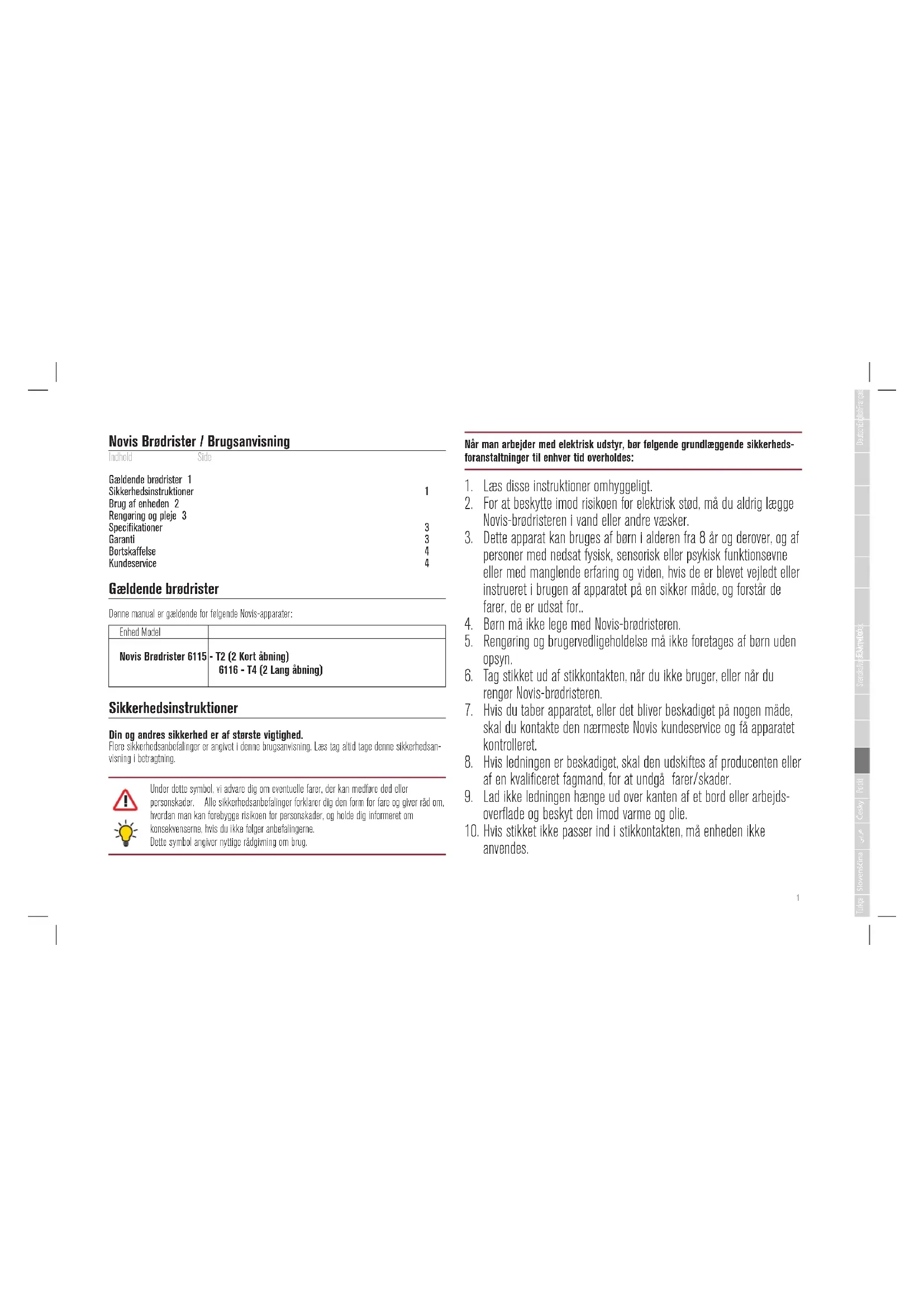 Novis Brødrister / Brugsanvisning Indhold Side Gældende brødrister 1 Sikkerhedsinstruktioner 1 Brug af enheden 2 Rengøring og pleje 3 Specifikationer 3 Garanti 3 Bortskaffelse 4 Kundeservice 4 Gældende brødrister Denne manual er gældende for følgende Novis-apparater: Enhed Model Novis Brødrister 6115 - T2 (2 Kort åbning) 6116 - T4 (2 Lang åbning) Sikkerhedsinstruktioner Din og andres sikkerhed er af største vigtighed. Flere sikkerhedsanbefalinger er angivet i denne brugsanvisning. Læs tag altid tage denne sikkerhedsan- visning i betragtning. Under dette symbol, vi advare dig om eventuelle farer, der kan medføre død eller personskader. Alle sikkerhedsanbefalinger forklarer dig den form for fare og giver råd om, hvordan man kan forebygge risikoen for personskader, og holde dig informeret om konsekvenserne, hvis du ikke følger anbefalingerne. Dette symbol angiver nyttige rådgivning om brug. Når man arbejder med elektrisk udstyr, bør følgende grundlæggende sikkerheds- foranstaltninger til enhver tid overholdes: