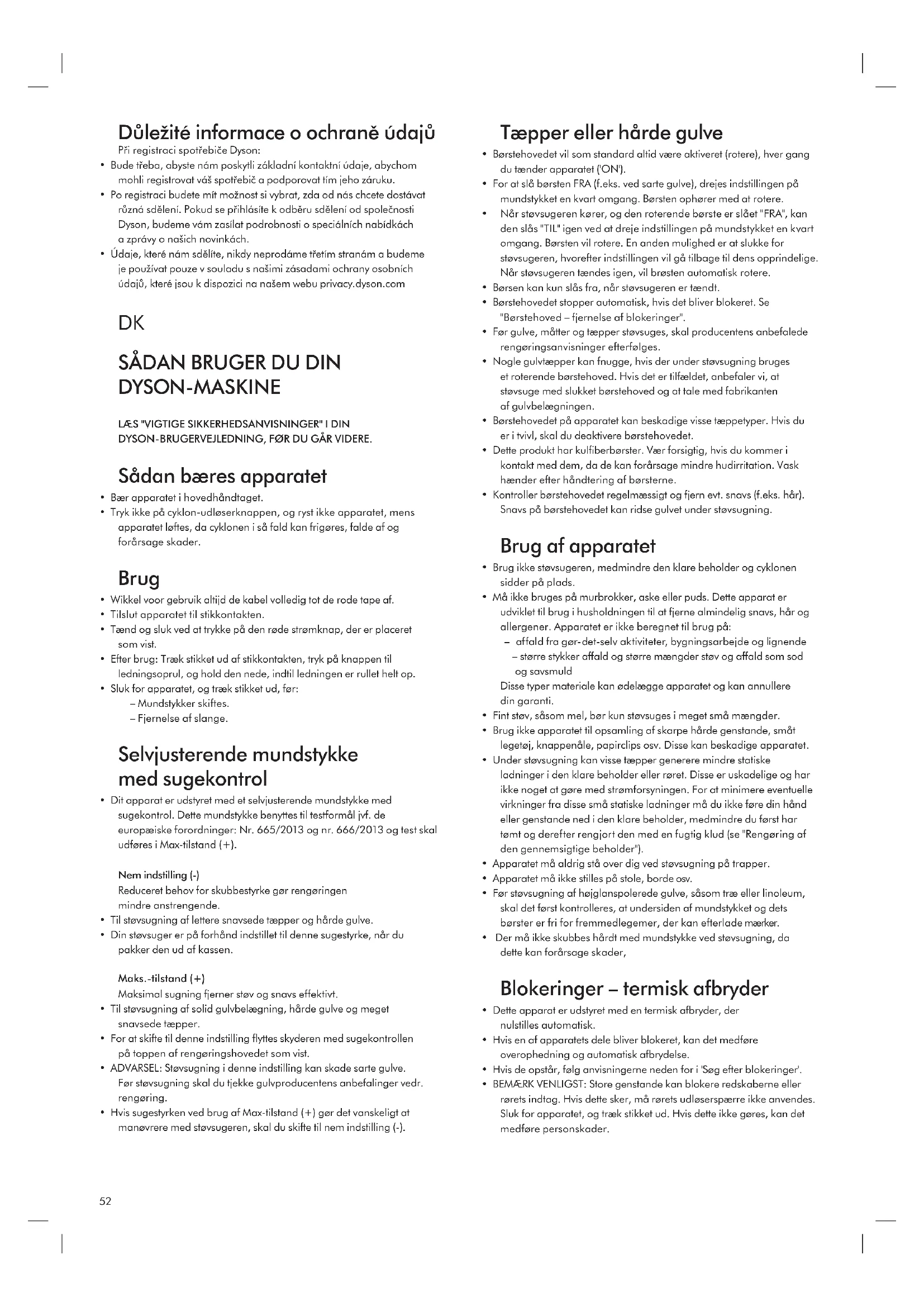 DENNE VEJLEDNING Dette Dyson-apparat er kun beregnet til husholdningsbrug. Træk ikke i ledningen. Opbevar ikke i nærheden af en varmekilde. Benyt ikke i nærheden af åben ild. Kør ikke over ledningen. Anvend ikke apparatet til opsamling af vand eller anden væske. Anvend ikke apparatet til opsamling af nogen form for brændende objekter. Anvend ikke maskinen over dig selv på trapper. Anbring ikke hænderne i nærheden af børstehovedet, når apparatet er i brug.14