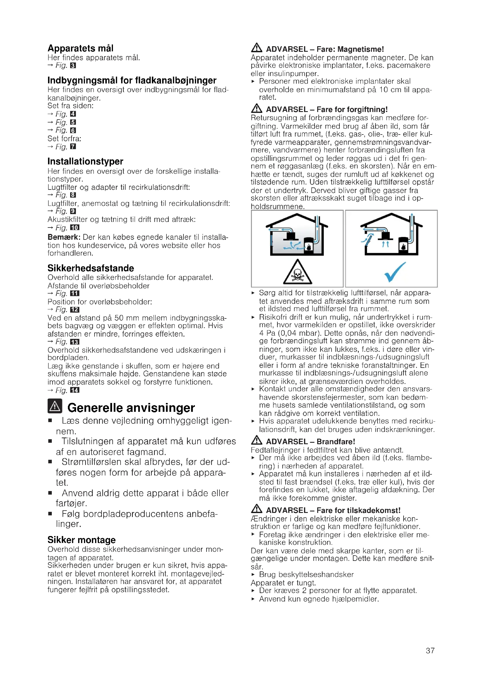 Personer med elektroniske implantater skal overholde en minimumafstand på 10cm til appa- ratet. ADVARSEL‒Fare for forgiftning! Retursugning af forbrændingsgas kan medføre for- giftning. Varmekilder med brug af åben ild, som får tilført luft fra rummet, (f.eks. gas-, olie-, træ- eller kul- fyrede varmeapparater, gennemstrømningsvandvar- mere, vandvarmere) henter forbrændingsluften fra opstillingsrummet og leder røggas ud i det fri gen- nem et røggasanlæg (f.eks. en skorsten). Når en em- hætte er tændt, suges der rumluft ud af køkkenet og tilstødende rum. Uden tilstrækkelig lufttilførsel opstår der et undertryk. Derved bliver giftige gasser fra skorsten eller aftræksskakt suget tilbage ind i op- holdsrummene.
