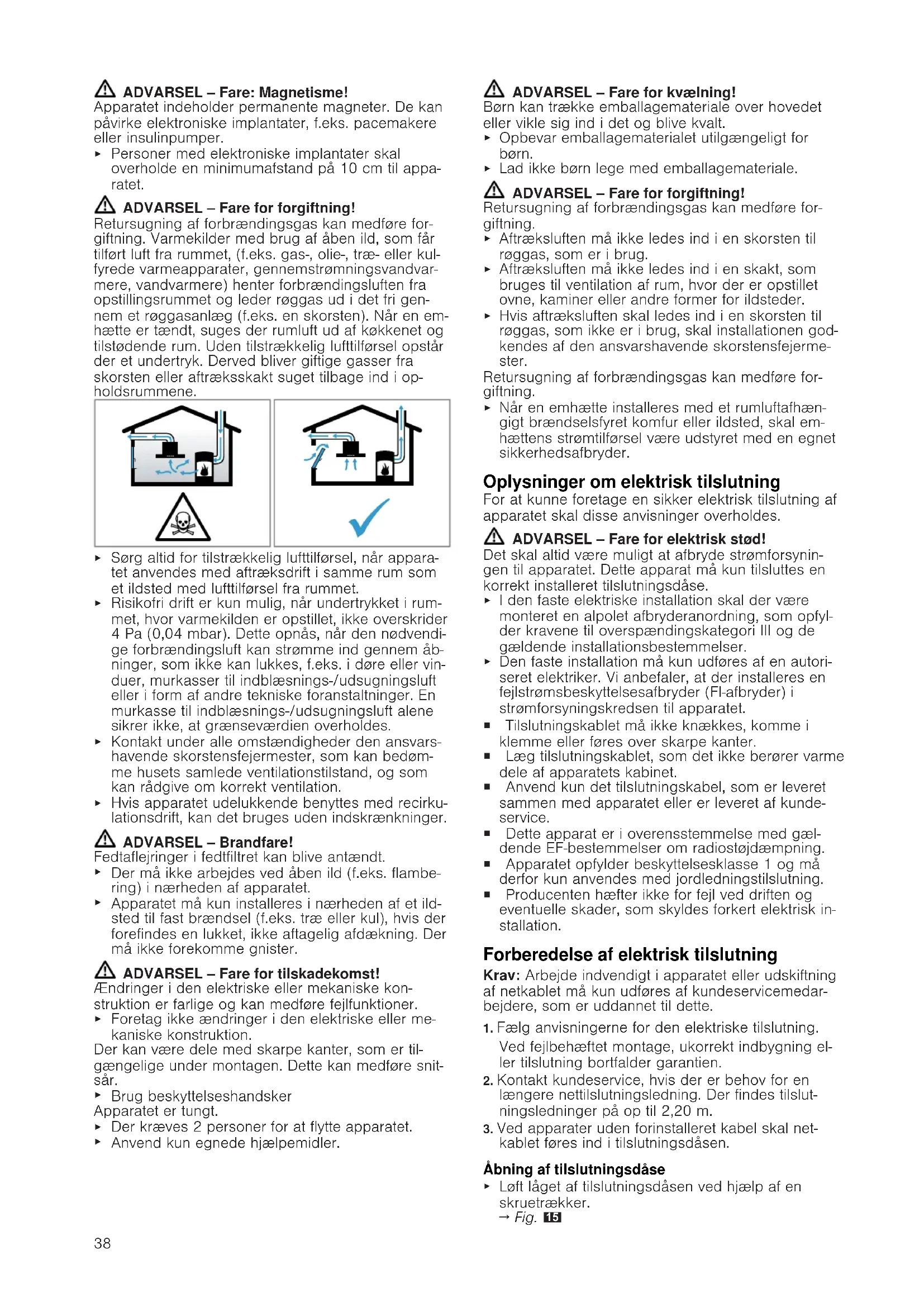 Sørg altid for tilstrækkelig lufttilførsel, når appara- tet anvendes med aftræksdrift i samme rum som et ildsted med lufttilførsel fra rummet.