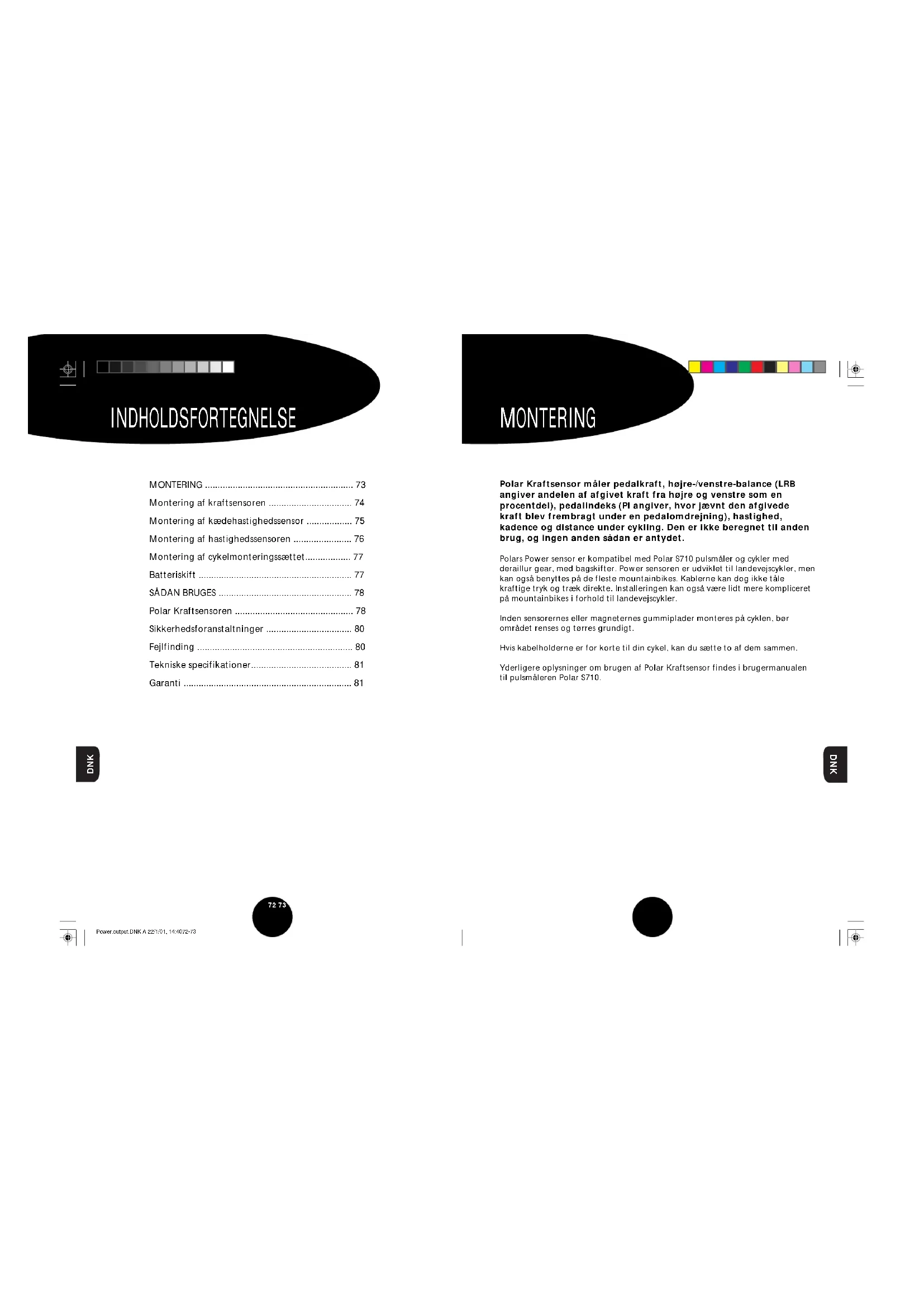 - Garanti Polar Kraftsensor måler pedalkraft, højre-/venstre-balance (LRB angiver andelen af afgivet kraft fra højre og venstre som en procentdel), pedalindeks (PI angiver, hvor jævnt den afgivede kraft blev frembragt under en pedalomdrejning), hastighed, kadence og distance under cykling. Den er ikke beregnet til anden brug, og ingen anden sådan er antydet. Polars Power sensor er kompatibel med Polar S710 pulsmåler og cykler med deraillur gear, med bagskifter. Power sensoren er udviklet til landevejscykler, men kan også benyttes på de fleste mountainbikes. Kablerne kan dog ikke tåle kraftige tryk og træk direkte. Installeringen kan også være lidt mere kompliceret på mountainbikes i forhold til landevejscykler. Inden sensorernes eller magneternes gummiplader monteres på cyklen, bør området renses og tørres grundigt. Hvis kabelholderne er for korte til din cykel, kan du sætte to af dem sammen. Yderligere oplysninger om brugen af Polar Kraftsensor findes i brugermanualen til pulsmåleren Polar S710. INDHOLDSFORTEGNELSE Power.output.DNK A 22/1/01, 14:4072-7374 75 DNK DNK p. 81