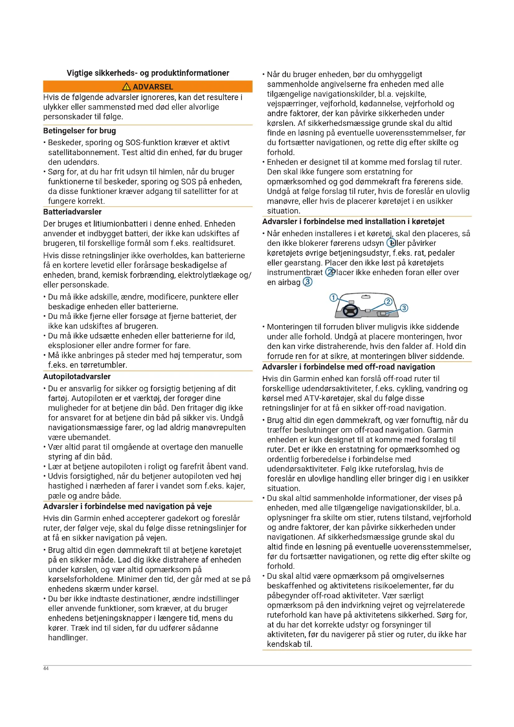 - Enheden er designet til at komme med forslag til ruter. Den skal ikke fungere som erstatning for opmærksomhed og god dømmekraft fra førerens side. Undgå at følge forslag til ruter, hvis de foreslår en ulovlig manøvre, eller hvis de placerer køretøjet i en usikker situation. Advarsler i forbindelse med installation i køretøjet