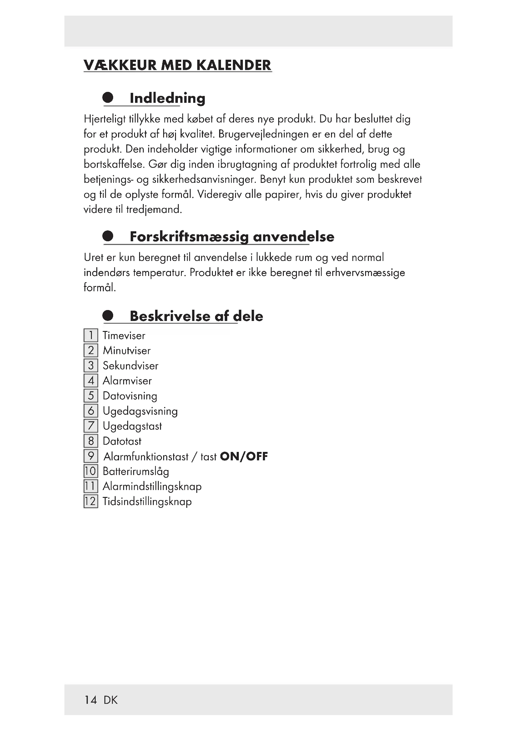 Indledning Hjerteligt tillykke med købet af deres nye produkt. Du har besluttet dig for et produkt af høj kvalitet. Brugervejledningen er en del af dette produkt. Den indeholder vigtige informationer om sikkerhed, brug og bortskaffelse. Gør dig inden ibrugtagning af produktet fortrolig med alle betjenings- og sikkerhedsanvisninger. Benyt kun produktet som beskrevet og til de oplyste formål. Videregiv alle papirer, hvis du giver produktet videre til tredjemand. Forskriftsmæssig anvendelse Uret er kun beregnet til anvendelse i lukkede rum og ved normal indendørs temperatur. Produktet er ikke beregnet til erhvervsmæssige formål. Beskrivelse af dele