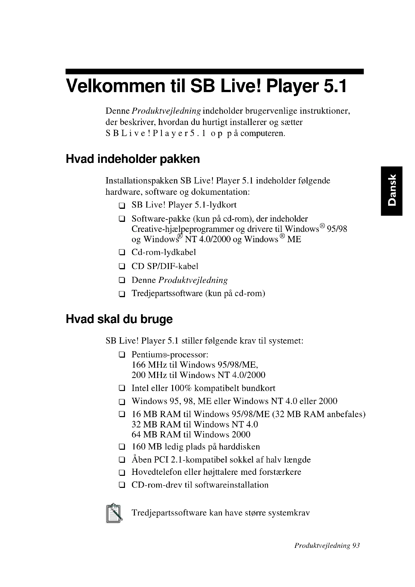 Tredjepartssoftware (kun på cd-rom) Hvad skal du bruge SB Live! Player 5.1 stiller følgende krav til systemet: