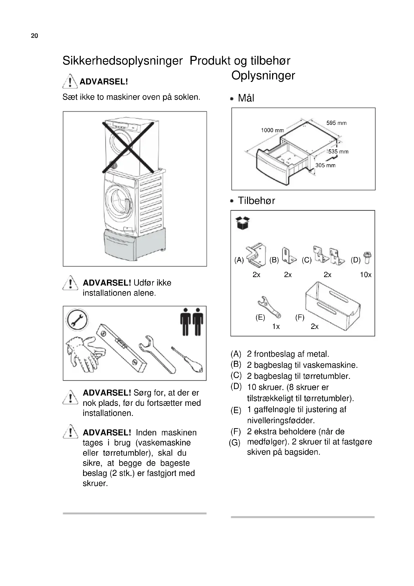 (F) Sikkerhedsoplysninger Produkt og tilbehør ADVARSEL! Sæt ikke to maskiner oven på soklen. Oplysninger Mål