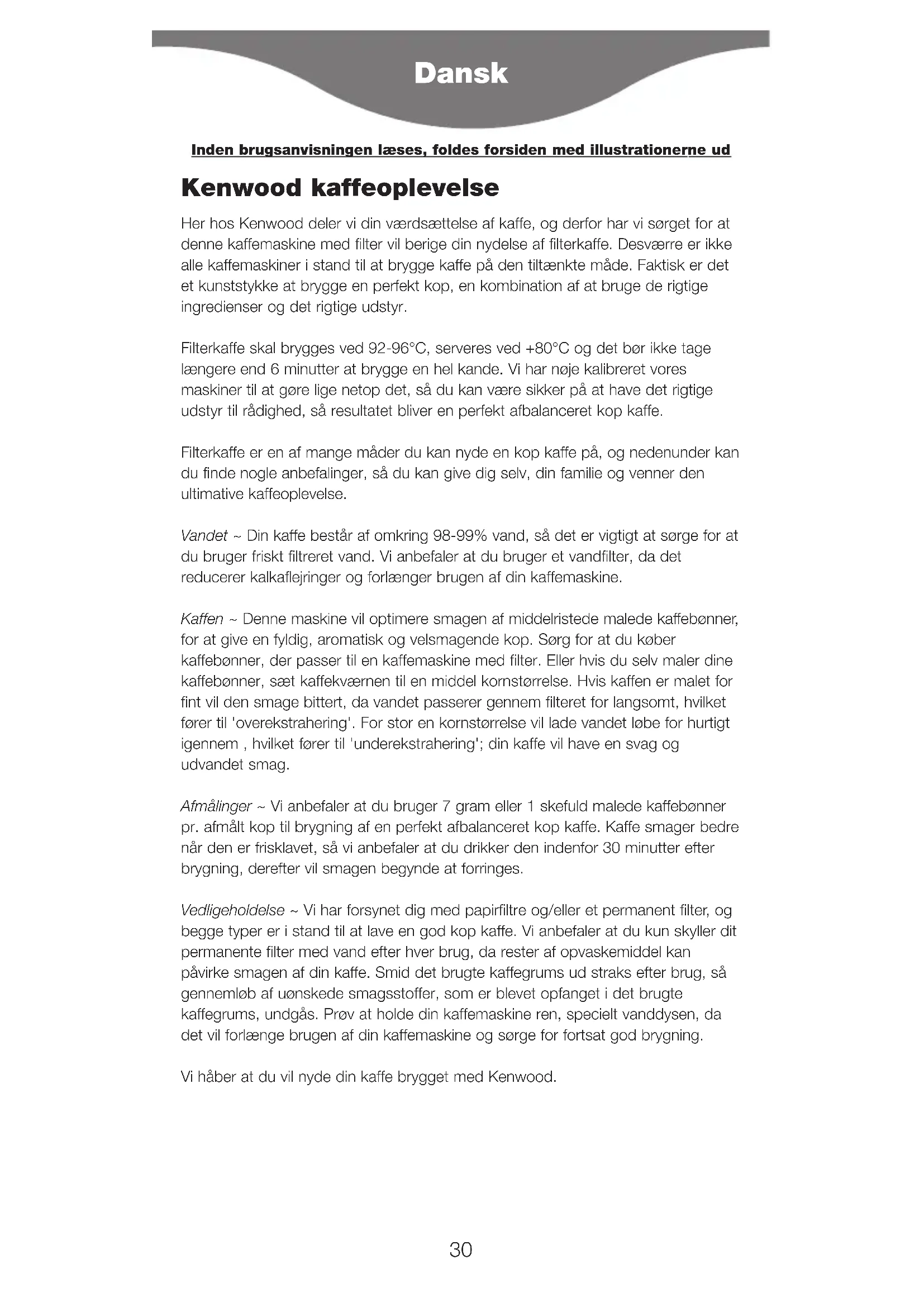 2002/96/CE. Al final de su vida útil, el producto no debe eliminarse junto a los desechos urbanos. Puede entregarse a centros específicos de recogida diferenciada dispuestos por las administraciones municipales, o a distribuidores que faciliten este servicio. Eliminar por separado un electrodoméstico significa evitar posibles consecuencias negativas para el medio ambiente y la salud derivadas de una eliminación inadecuada, y permite reciclar los materiales que lo componen, obteniendo así un ahorro importante de energía y recursos. Para subrayar la obligación de eliminar por separado los electrodomésticos, en el producto aparece un contenedor de basura móvil tachado. 29Kenwood kaffeoplevelse Her hos Kenwood deler vi din værdsættelse af kaffe, og derfor har vi sørget for at denne kaffemaskine med filter vil berige din nydelse af filterkaffe. Desværre er ikke alle kaffemaskiner i stand til at brygge kaffe på den tiltænkte måde. Faktisk er det et kunststykke at brygge en perfekt kop, en kombination af at bruge de rigtige ingredienser og det rigtige udstyr. Filterkaffe skal brygges ved 92-96°C, serveres ved +80°C og det bør ikke tage længere end 6 minutter at brygge en hel kande. Vi har nøje kalibreret vores maskiner til at gøre lige netop det, så du kan være sikker på at have det rigtige udstyr til rådighed, så resultatet bliver en perfekt afbalanceret kop kaffe. Filterkaffe er en af mange måder du kan nyde en kop kaffe på, og nedenunder kan du finde nogle anbefalinger, så du kan give dig selv, din familie og venner den ultimative kaffeoplevelse. Vandet ~ Din kaffe består af omkring 98-99% vand, så det er vigtigt at sørge for at du bruger friskt filtreret vand. Vi anbefaler at du bruger et vandfilter, da det reducerer kalkaflejringer og forlænger brugen af din kaffemaskine. Kaffen ~ Denne maskine vil optimere smagen af middelristede malede kaffebønner, for at give en fyldig, aromatisk og velsmagende kop. Sørg for at du køber kaffebønner, der passer til en kaffemaskine med filter. Eller hvis du selv maler dine kaffebønner, sæt kaffekværnen til en middel kornstørrelse. Hvis kaffen er malet for fint vil den smage bittert, da vandet passerer gennem filteret for langsomt, hvilket fører til 'overekstrahering'. For stor en kornstørrelse vil lade vandet løbe for hurtigt igennem , hvilket fører til 'underekstrahering'; din kaffe vil have en svag og udvandet smag. Afmålinger ~ Vi anbefaler at du bruger 7 gram eller 1 skefuld malede kaffebønner pr. afmålt kop til brygning af en perfekt afbalanceret kop kaffe. Kaffe smager bedre når den er frisklavet, så vi anbefaler at du drikker den indenfor 30 minutter efter brygning, derefter vil smagen begynde at forringes. Vedligeholdelse ~ Vi har forsynet dig med papirfiltre og/eller et permanent filter, og begge typer er i stand til at lave en god kop kaffe. Vi anbefaler at du kun skyller dit permanente filter med vand efter hver brug, da rester af opvaskemiddel kan påvirke smagen af din kaffe. Smid det brugte kaffegrums ud straks efter brug, så gennemløb af uønskede smagsstoffer, som er blevet opfanget i det brugte kaffegrums, undgås. Prøv at holde din kaffemaskine ren, specielt vanddysen, da det vil forlænge brugen af din kaffemaskine og sørge for fortsat god brygning. Vi håber at du vil nyde din kaffe brygget med Kenwood. Dansk