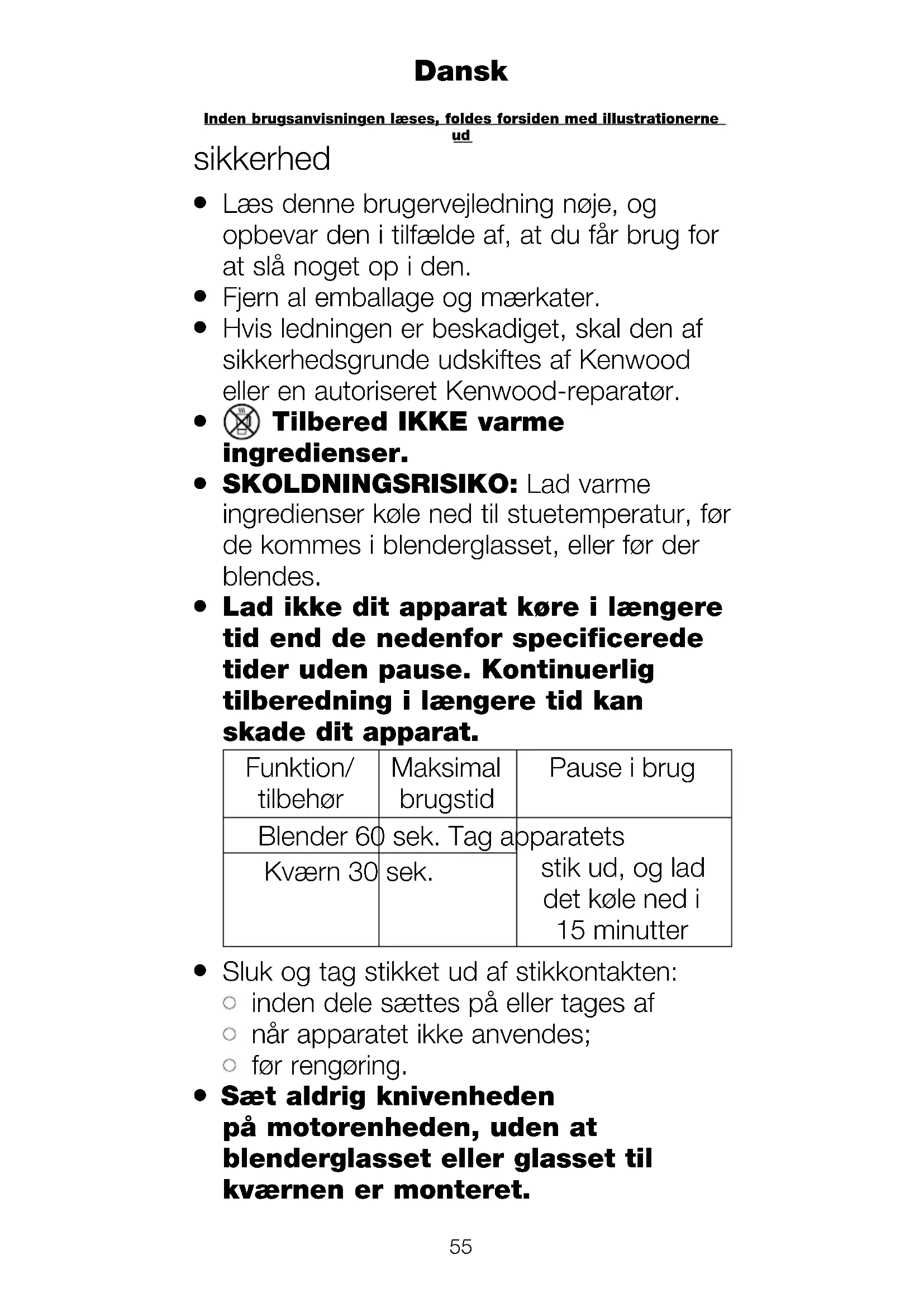 Anvend kun apparatet til husholdningsbrug. Kenwood påtager sig intet erstatningsansvar, hvis apparatet ikke anvendes korrekt, eller disse instruktioner ikke følges. før stikket sættes i stikkontakten