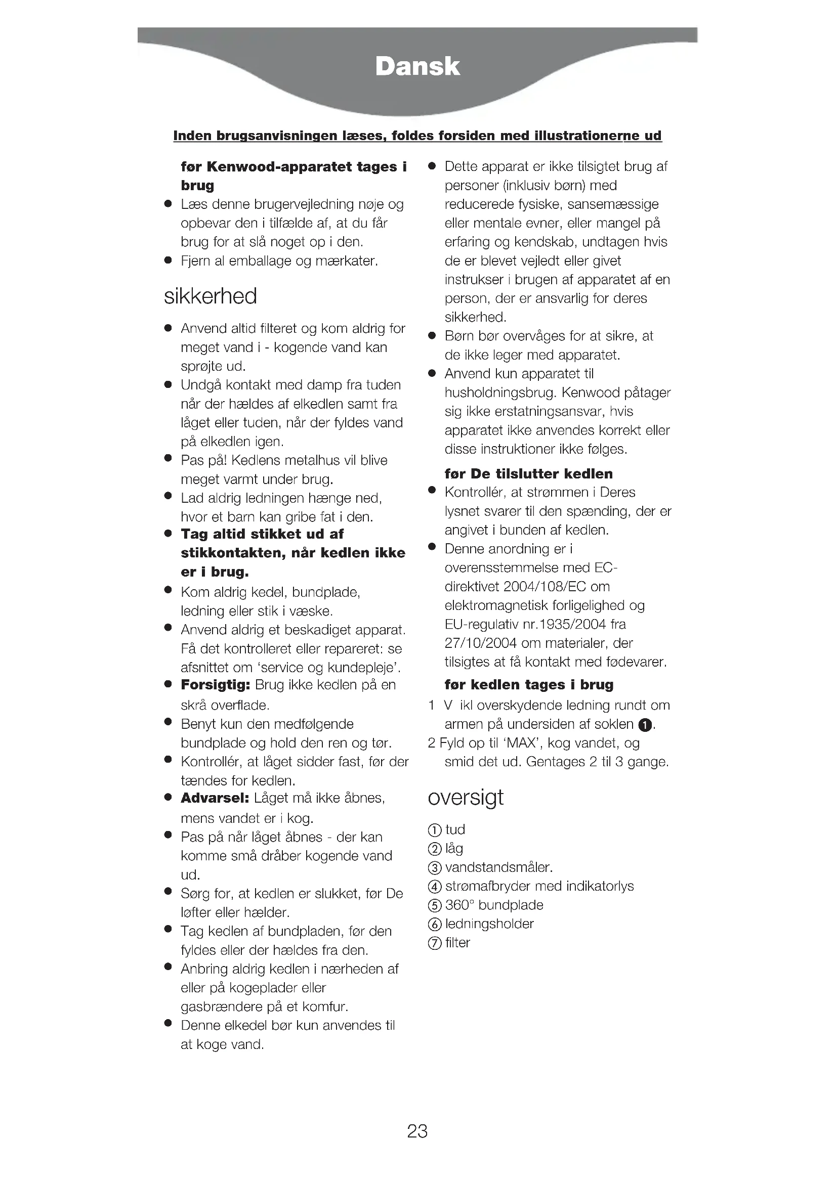 Anvend kun apparatet til husholdningsbrug. Kenwood påtager sig ikke erstatningsansvar, hvis apparatet ikke anvendes korrekt eller disse instruktioner ikke følges. før De tilslutter kedlen