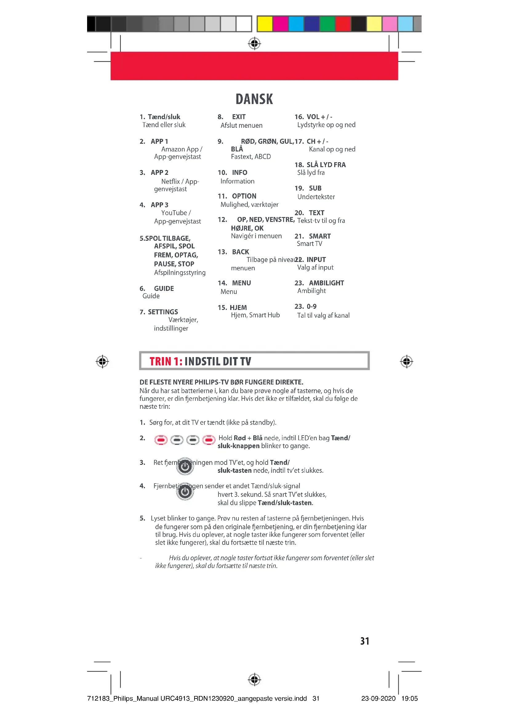 NEDERLANDS 712183_Philips_Manual URC4913_RDN1230920_aangepaste versie.indd 30712183_Philips_Manual URC4913_RDN1230920_aangepaste versie.indd 30 23-09-2020 19:0523-09-2020 19:0531 DANSK DE FLESTE NYERE PHILIPS-TV BØR FUNGERE DIREKTE. Når du har sat batterierne i, kan du bare prøve nogle af tasterne, og hvis de fungerer, er din ernbetjening klar. Hvis det ikke er tilfældet, skal du følge de næste trin: