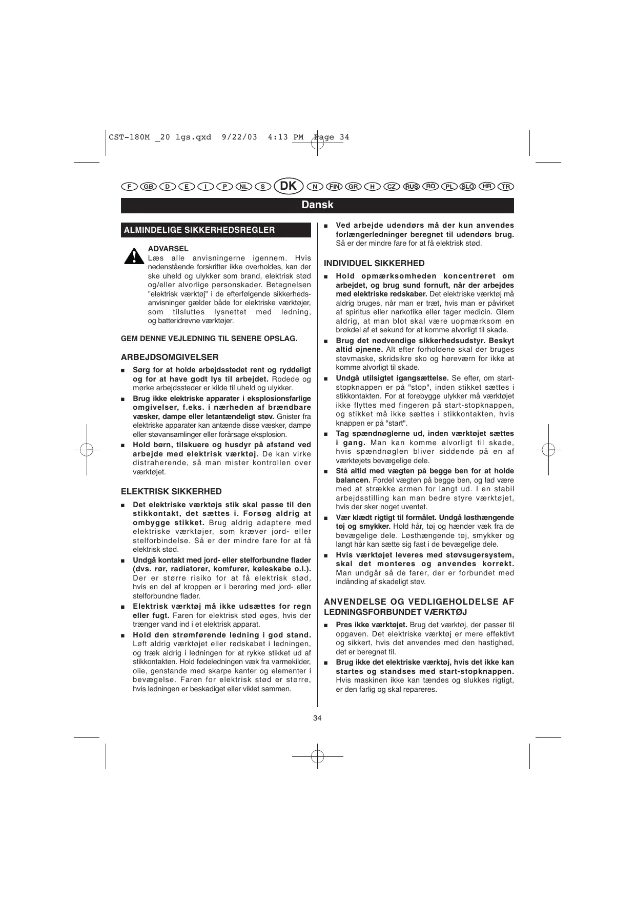 Læs alle anvisningerne igennem. Hvis nedenstaende forskrifter违法犯罪, kan der ske uheld og ulykker som brand, elektrisk stød og/eller alvorlige personskader. Betegnelsen "elektrisk værktoj" i defterfolgende sikkerheds-anvisninger gælder både for elektriske værktøjer, som tilstulttes lysnettet med ledning, og batteridrevne værktøjer.