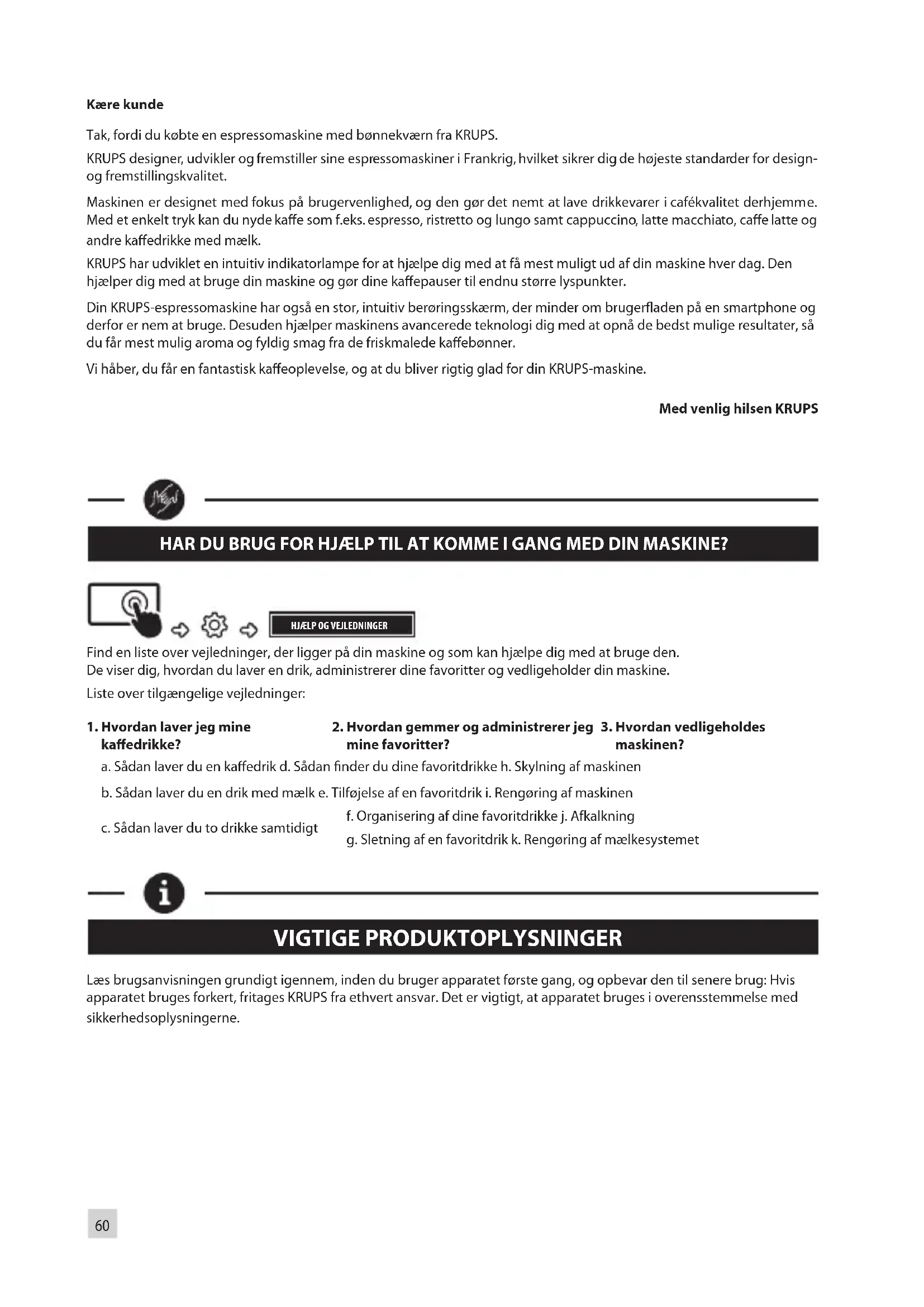 Belangrijk: Fabricage: SAS GSM Rue Saint-Léonard F-53104 Mayenne - Frankrijk60 Kære kunde Tak, fordi du købte en espressomaskine med bønnekværn fra KRUPS. KRUPS designer, udvikler og fremstiller sine espressomaskiner i Frankrig, hvilket sikrer dig de højeste standarder for design- og fremstillingskvalitet. Maskinen er designet med fokus på brugervenlighed, og den gør det nemt at lave drikkevarer i cafékvalitet derhjemme. Med et enkelt tryk kan du nyde kaffe som f.eks. espresso, ristretto og lungo samt cappuccino, latte macchiato, caffe latte og andre kaffedrikke med mælk. KRUPS har udviklet en intuitiv indikatorlampe for at hjælpe dig med at få mest muligt ud af din maskine hver dag. Den hjælper dig med at bruge din maskine og gør dine kaffepauser til endnu større lyspunkter. Din KRUPS-espressomaskine har også en stor, intuitiv berøringsskærm, der minder om brugerfladen på en smartphone og derfor er nem at bruge. Desuden hjælper maskinens avancerede teknologi dig med at opnå de bedst mulige resultater, så du får mest mulig aroma og fyldig smag fra de friskmalede kaffebønner. Vi håber, du får en fantastisk kaffeoplevelse, og at du bliver rigtig glad for din KRUPS-maskine. Med venlig hilsen KRUPS HAR DU BRUG FOR HJÆLP TIL AT KOMME I GANG MED DIN MASKINE?