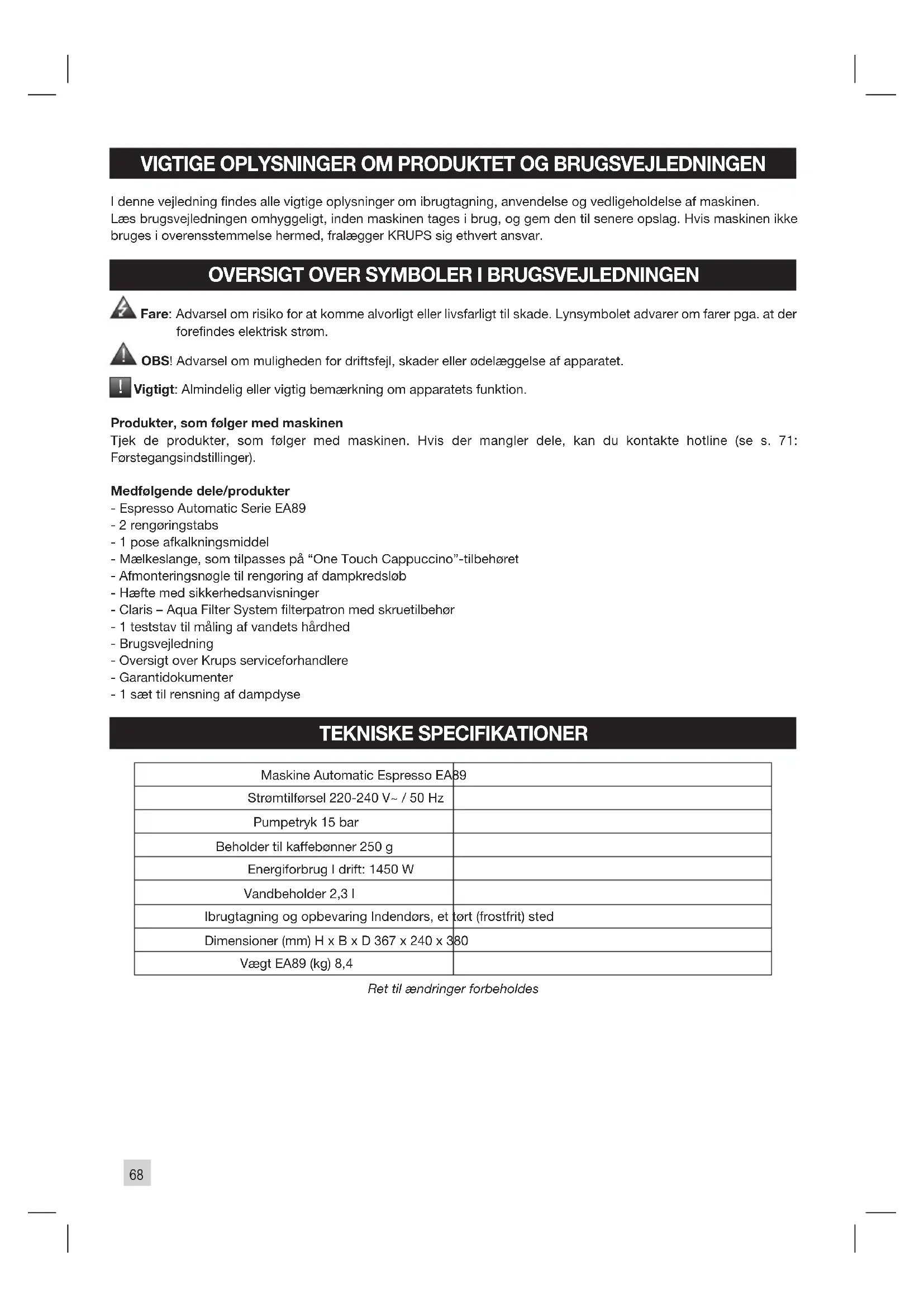 Vigtigt: Almindelig eller vigtig bemærkning om apparatets funktion. Produkter, som følger med maskinen Tjek de produkter, som følger med maskinen. Hvis der mangler dele, kan du kontakte hotline (se s. 71: Førstegangsindstillinger). Medfølgende dele/produkter - Espresso Automatic Serie EA89 - 2 rengøringstabs - 1 pose afkalkningsmiddel - Mælkeslange, som tilpasses på “One Touch Cappuccino”-tilbehøret - Afmonteringsnøgle til rengøring af dampkredsløb - Hæfte med sikkerhedsanvisninger - Claris – Aqua Filter System lterpatron med skruetilbehør - 1 teststav til måling af vandets hårdhed - Brugsvejledning - Oversigt over Krups serviceforhandlere - Garantidokumenter - 1 sæt til rensning af dampdyse TEKNISKE SPECIFIKATIONER Maskine Automatic Espresso EA89 Strømtilførsel 220-240 V~ / 50 Hz Pumpetryk 15 bar Beholder til kaffebønner 250 g Energiforbrug I drift: 1450 W Vandbeholder 2,3 l Ibrugtagning og opbevaring Indendørs, et tørt (frostfrit) sted Dimensioner (mm) H x B x D 367 x 240 x 380 Vægt EA89 (kg) 8,4 Ret til ændringer forbeholdes69
