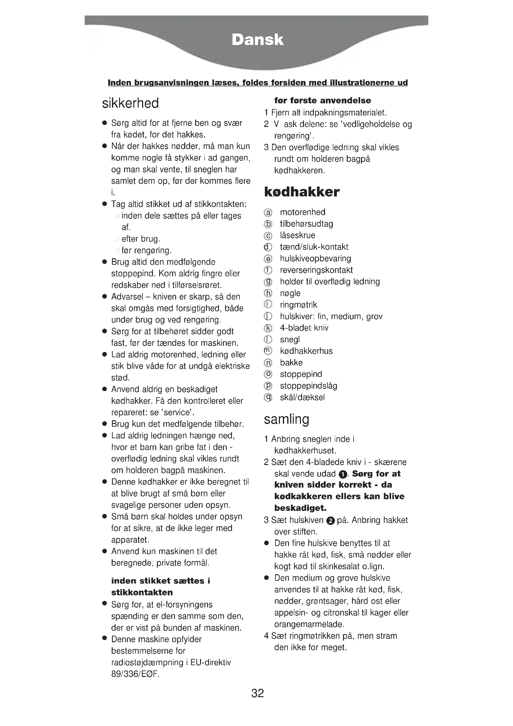 Denne maskine opfylder bestemmelserne for radiostøjdæmpning i EU-direktiv 89/336/EØF. før første anvendelse 1 Fjern alt indpakningsmaterialet. 2Vask delene: se 'vedligeholdelse og rengøring'. 3 Den overflødige ledning skal vikles rundt om holderen bagpå kødhakkeren. kødhakker motorenhed tilbehørsudtag låseskrue tænd/sluk-kontakt hulskiveopbevaring reverseringskontakt holder til overflødig ledning nøgle ringmøtrik hulskiver: fin, medium, grov 4-bladet kniv snegl kødhakkerhus bakke stoppepind stoppepindslåg skål/dæksel samling 1 Anbring sneglen inde i kødhakkerhuset. 2 Sæt den 4-bladede kniv i - skærene skal vende udad . Sørg for at kniven sidder korrekt - da kødkakkeren ellers kan blive beskadiget. 3 Sæt hulskiven på. Anbring hakket over stiften.