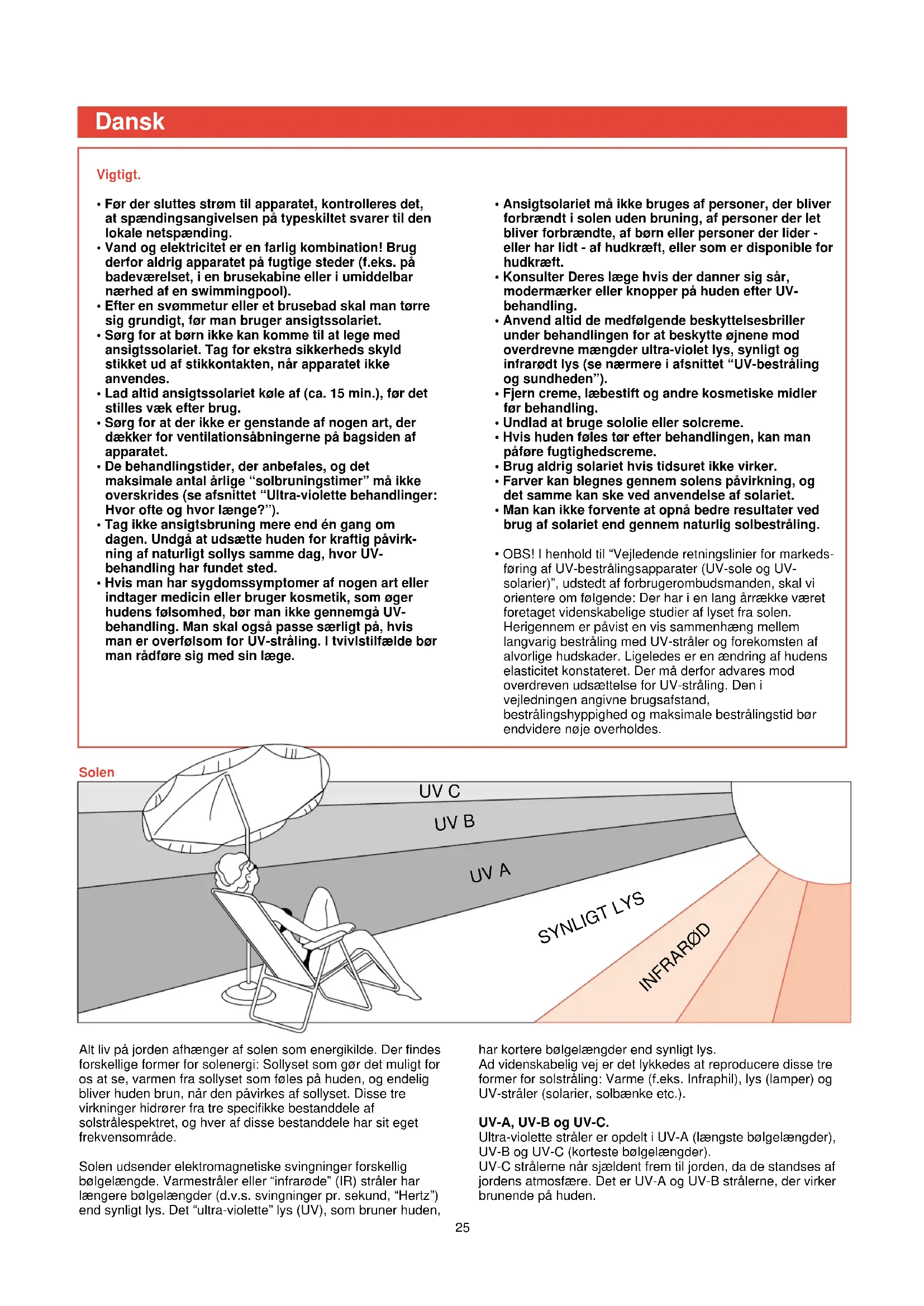 - OBS! I henhold til “Vejledende retningslinier for markeds- føring af UV-bestrålingsapparater (UV-sole og UV- solarier)”, udstedt af forbrugerombudsmanden, skal vi orientere om følgende: Der har i en lang årrække været foretaget videnskabelige studier af lyset fra solen.Herigennem er påvist en vis sammenhæng mellemlangvarig bestråling med UV-stråler og forekomsten afalvorlige hudskader. Ligeledes er en ændring af hudenselasticitet konstateret. Der må derfor advares modoverdreven udsættelse for UV-stråling. Den ivejledningen angivne brugsafstand, bestrålingshyppighed og maksimale bestrålingstid bør endvidere nøje overholdes. Alt liv på jorden afhænger af solen som energikilde. Der findes forskellige former for solenergi: Sollyset som gør det muligt foros at se, varmen fra sollyset som føles på huden, og endeligbliver huden brun, når den påvirkes af sollyset. Disse trevirkninger hidrører fra tre specifikke bestanddele afsolstrålespektret, og hver af disse bestanddele har sit egetfrekvensområde.Solen udsender elektromagnetiske svingninger forskellig bølgelængde. Varmestråler eller “infrarøde” (IR) stråler har længere bølgelængder (d.v.s. svingninger pr. sekund, “Hertz”) end synligt lys. Det “ultra-violette” lys (UV), som bruner huden, har kortere bølgelængder end synligt lys.Ad videnskabelig vej er det lykkedes at reproducere disse treformer for solstråling: Varme (f.eks. Infraphil), lys (lamper) ogUV-stråler (solarier, solbænke etc.).UV-A, UV-B og UV-C. Ultra-violette stråler er opdelt i UV-A (længste bølgelængder), UV-B og UV-C (korteste bølgelængder). UV-C strålerne når sjældent frem til jorden, da de standses af jordens atmosfære. Det er UV-A og UV-B strålerne, der virkerbrunende på huden.