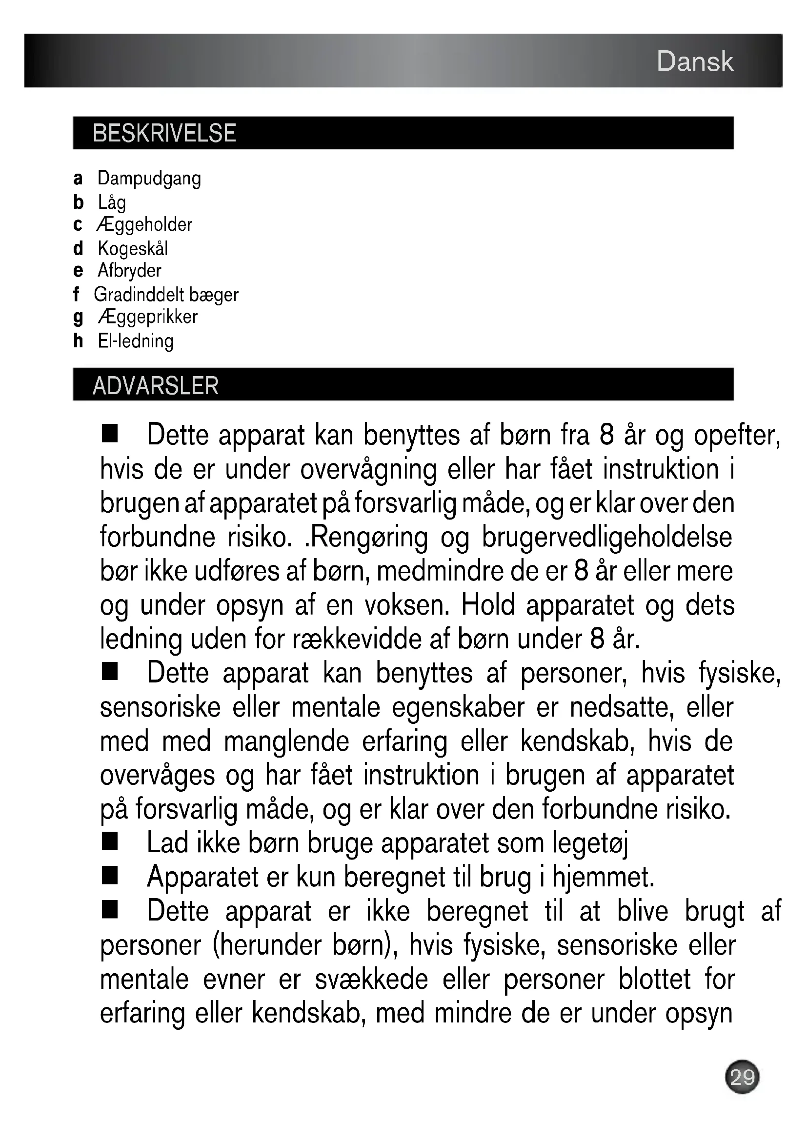 Når vandet er fordampet, lyder der et signal, som angiver at æggene er kogt. Sæt afbryderen på position O. (9) Anbring ikke hænderne oven over denne åbning under kogningen.33 Dansk
