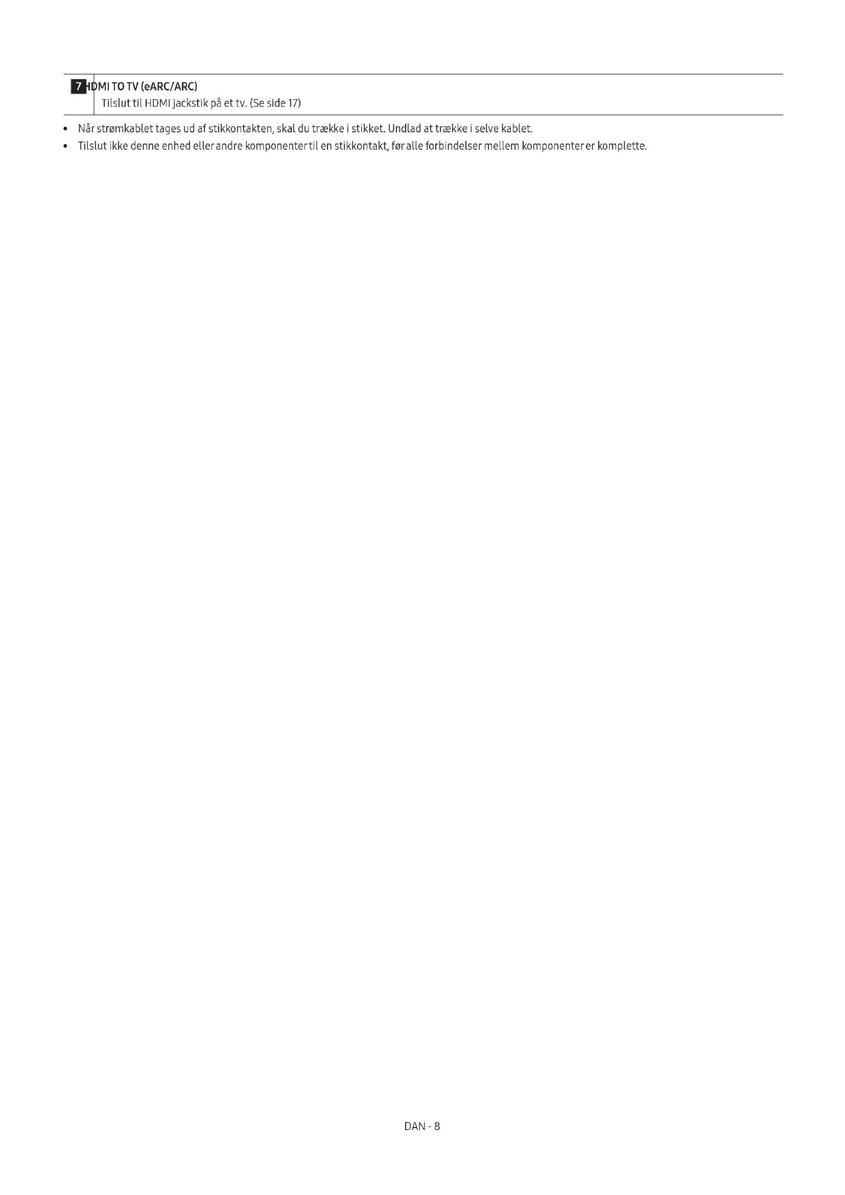 1 POWER Tilslut Soundbars vekselstrømskabel. (Se side 13) 2 ID SET (WOOFER/REAR) Tryk for trådløst at forbinde soundbaren til surroundsound-højttalere og en subwoofer. 3 NETWORK Tryk for at tilslutte et trådløst netværk (Wi-Fi) gennem SmartThings appen. 4 SERVICE Tilslut en USB-lagringsenhed for at opgradere produktets software. 5 DIGITAL AUDIO IN (OPTICAL) Tilslut den digitale (optiske) udgang af en ekstern enhed. (Se side 22) 6 HDMI 1/HDMI 2 Indlæser digitale video- og lydsignaler samtidigt ved hjælp af et HDMI-kabel. Tilslut til HDMI-udgangen på en ekstern enhed. (Se side 21)DAN - 8 7 HDMI TO TV (eARC/ARC) Tilslut til HDMI jackstik på et tv. (Se side 17)