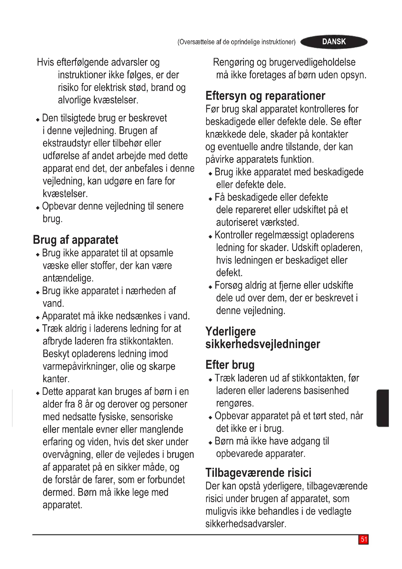 Advarsel! Læs alle sikkerhedsadvarsler og alle instruktioner.51 (Oversættelse af de oprindelige instruktioner) DANSK Hvis efterfølgende advarsler og instruktioner ikke følges, er der risiko for elektrisk stød, brand og alvorlige kvæstelser. u Den tilsigtede brug er beskrevet i denne vejledning. Brugen af ekstraudstyr eller tilbehør eller udførelse af andet arbejde med dette apparat end det, der anbefales i denne vejledning, kan udgøre en fare for kvæstelser. u Opbevar denne vejledning til senere brug. Brug af apparatet u Brug ikke apparatet til at opsamle væske eller stoffer, der kan være antændelige. u Brug ikke apparatet i nærheden af vand. u Apparatet må ikke nedsænkes i vand.u Træk aldrig i laderens ledning for at afbryde laderen fra stikkontakten. Beskyt opladerens ledning imod varmepåvirkninger, olie og skarpe kanter. u Dette apparat kan bruges af børn i en alder fra 8 år og derover og personer med nedsatte fysiske, sensoriske eller mentale evner eller manglende erfaring og viden, hvis det sker under overvågning, eller de vejledes i brugen af apparatet på en sikker måde, og de forstår de farer, som er forbundet dermed. Børn må ikke lege med apparatet. Rengøring og brugervedligeholdelse må ikke foretages af børn uden opsyn. Eftersyn og reparationer Før brug skal apparatet kontrolleres for beskadigede eller defekte dele. Se efter knækkede dele, skader på kontakter og eventuelle andre tilstande, der kan påvirke apparatets funktion. u Brug ikke apparatet med beskadigede eller defekte dele. u Få beskadigede eller defekte dele repareret eller udskiftet på et autoriseret værksted. u Kontroller regelmæssigt opladerens ledning for skader. Udskift opladeren, hvis ledningen er beskadiget eller defekt. u Forsøg aldrig at fjerne eller udskifte dele ud over dem, der er beskrevet i denne vejledning. Yderligere sikkerhedsvejledninger Efter brug u Træk laderen ud af stikkontakten, før laderen eller laderens basisenhed rengøres. u Opbevar apparatet på et tørt sted, når det ikke er i brug. u Børn må ikke have adgang til opbevarede apparater. Tilbageværende risici Der kan opstå yderligere, tilbageværende risici under brugen af apparatet, som muligvis ikke behandles i de vedlagte sikkerhedsadvarsler.52 (Oversættelse af de oprindelige instruktioner)DANSK Disse risici kan opstå pga. forkert anvendelse, langvarig brug etc. Selv ved overholdelse af relevante sikkerhedsforskrifter og anvendelse af sikkerhedsudstyr kan visse resterende risici ikke undgås. Disse omfatter: u Tilskadekomst forårsaget af berøring afroterende/bevægeligedele. u Tilskadekomst forårsaget af udskiftning af dele, klinger eller tilbehør. u Tilskadekomst forårsaget af langvarig brug af et værktøj. Husk at holde pause jævnligt ved brug af et apparat i længere tid. u Hørenedsættelse.u Sundhedsrisici forårsaget af indånding af støv, der genereres ved brug af værktøjet (eksempel: arbejde med træ, især, eg, bøg og MDF.) Opladere Opladerenerudviklettilenspecik spænding. Kontroller altid, at netspændingen svarer til spændingen på typeskiltet. Advarsel! Forsøg aldrig at erstatte opladerenheden med et almindeligt netstik. u Brug kun din BLACK+DECKER-lader til at oplade batteriet i det værktøj, som den blev leveret sammen med. Andre batterier kan eksplodere og forårsage kvæstelser og materielle skader. u Forsøg aldrig at oplade ikke- genopladelige batterier. u Hvis netledningen beskadiges, skal den udskiftes af producenten eller et autoriseret BLACK+DECKER- værksted, så farlige situationer undgås. u Opladeren må ikke udsættes for fugt.u Opladeren må ikke åbnes.u Opladeren må ikke undersøges.u Apparatet/værktøjet/batterietskal anbringes et sted med god udluftning, når det oplades. Elektricitet og sikkerhed Symboler på opladeren Læs hele vejledningen omhyggeligt, før du bruger apparatet. Dette værktøj er dobbelt isoleret, derfor er en jordledning ikke nødvendig. Kontrollér altid, at strømforsyningen svarer til spændingen på mærkepladen. Opladerens basisenhed er kun beregnet til indendørs brug.Mærkater på apparatetApparatet er forsynet med følgende advarselssymboler samt datokoden Læs hele vejledningen omhyggeligt, før du bruger apparatetse oplader 90616337-01FunktionerUdstyret har nogle eller alle af de efterfølgende funktioner. 1.Tænd/sluk-knap 2. 3-hastighedskontakt2a. Aktiveringsknap til tæppebanker 3. Ladeindikator 4. 36V batteri 5. 36V oplader 6. Støvbeholder til aftagning medlteragitator 7. Støvbeholderdæksel 8. Gulvmundstykke 9. Forlængerrør 10. 2-i-1 tilbehørsværktøj S010Q 23 90616337-0153 (Oversættelse af de oprindelige instruktioner) DANSK