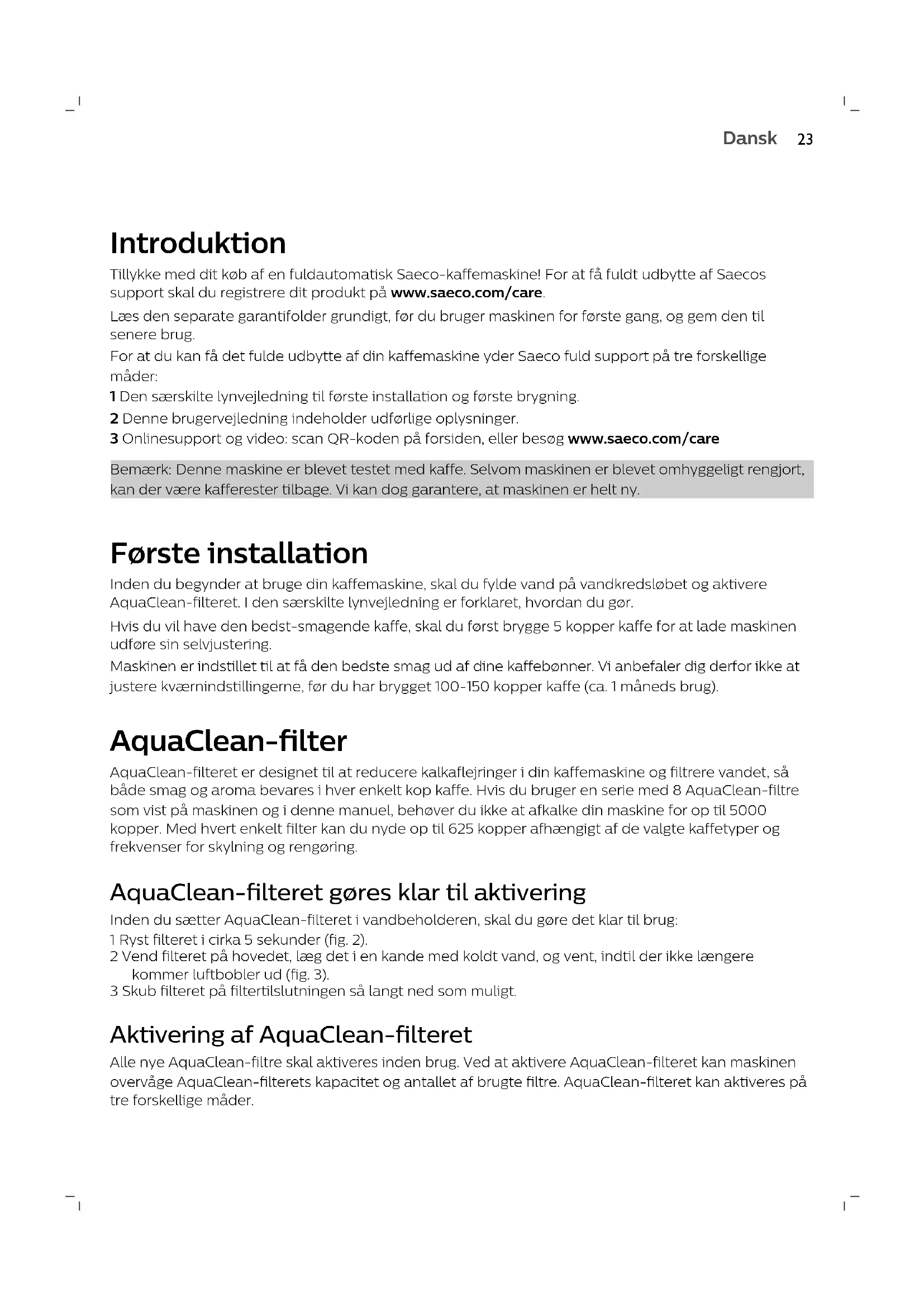 Dansk 17 KaffeudløbskanalIntroduktion Tillykke med dit køb af en fuldautomatisk Saeco-kaffemaskine! For at få fuldt udbytte af Saecos support skal du registrere dit produkt på www.saeco.com/care. Læs den separate garantifolder grundigt, før du bruger maskinen for første gang, og gem den til senere brug. For at du kan få det fulde udbytte af din kaffemaskine yder Saeco fuld support på tre forskellige måder: 1 Den særskilte lynvejledning til første installation og første brygning. 2 Denne brugervejledning indeholder udførlige oplysninger. 3 Onlinesupport og video: scan QR-koden på forsiden, eller besøg www.saeco.com/care Bemærk: Denne maskine er blevet testet med kaffe. Selvom maskinen er blevet omhyggeligt rengjort, kan der være kafferester tilbage. Vi kan dog garantere, at maskinen er helt ny. Første installation Inden du begynder at bruge din kaffemaskine, skal du fylde vand på vandkredsløbet og aktivere AquaClean-filteret. I den særskilte lynvejledning er forklaret, hvordan du gør. Hvis du vil have den bedst-smagende kaffe, skal du først brygge 5 kopper kaffe for at lade maskinen udføre sin selvjustering. Maskinen er indstillet til at få den bedste smag ud af dine kaffebønner. Vi anbefaler dig derfor ikke at justere kværnindstillingerne, før du har brygget 100-150 kopper kaffe (ca. 1 måneds brug). AquaClean-filter AquaClean-filteret er designet til at reducere kalkaflejringer i din kaffemaskine og filtrere vandet, så både smag og aroma bevares i hver enkelt kop kaffe. Hvis du bruger en serie med 8 AquaClean-filtre som vist på maskinen og i denne manuel, behøver du ikke at afkalke din maskine for op til 5000 kopper. Med hvert enkelt filter kan du nyde op til 625 kopper afhængigt af de valgte kaffetyper og frekvenser for skylning og rengøring. AquaClean-filteret gøres klar til aktivering Inden du sætter AquaClean-filteret i vandbeholderen, skal du gøre det klar til brug: 1 Ryst filteret i cirka 5 sekunder (fig. 2). 2 Vend filteret på hovedet, læg det i en kande med koldt vand, og vent, indtil der ikke længere kommer luftbobler ud (fig. 3). 3 Skub filteret på filtertilslutningen så langt ned som muligt. Aktivering af AquaClean-filteret Alle nye AquaClean-filtre skal aktiveres inden brug. Ved at aktivere AquaClean-filteret kan maskinen overvåge AquaClean-filterets kapacitet og antallet af brugte filtre. AquaClean-filteret kan aktiveres på tre forskellige måder.