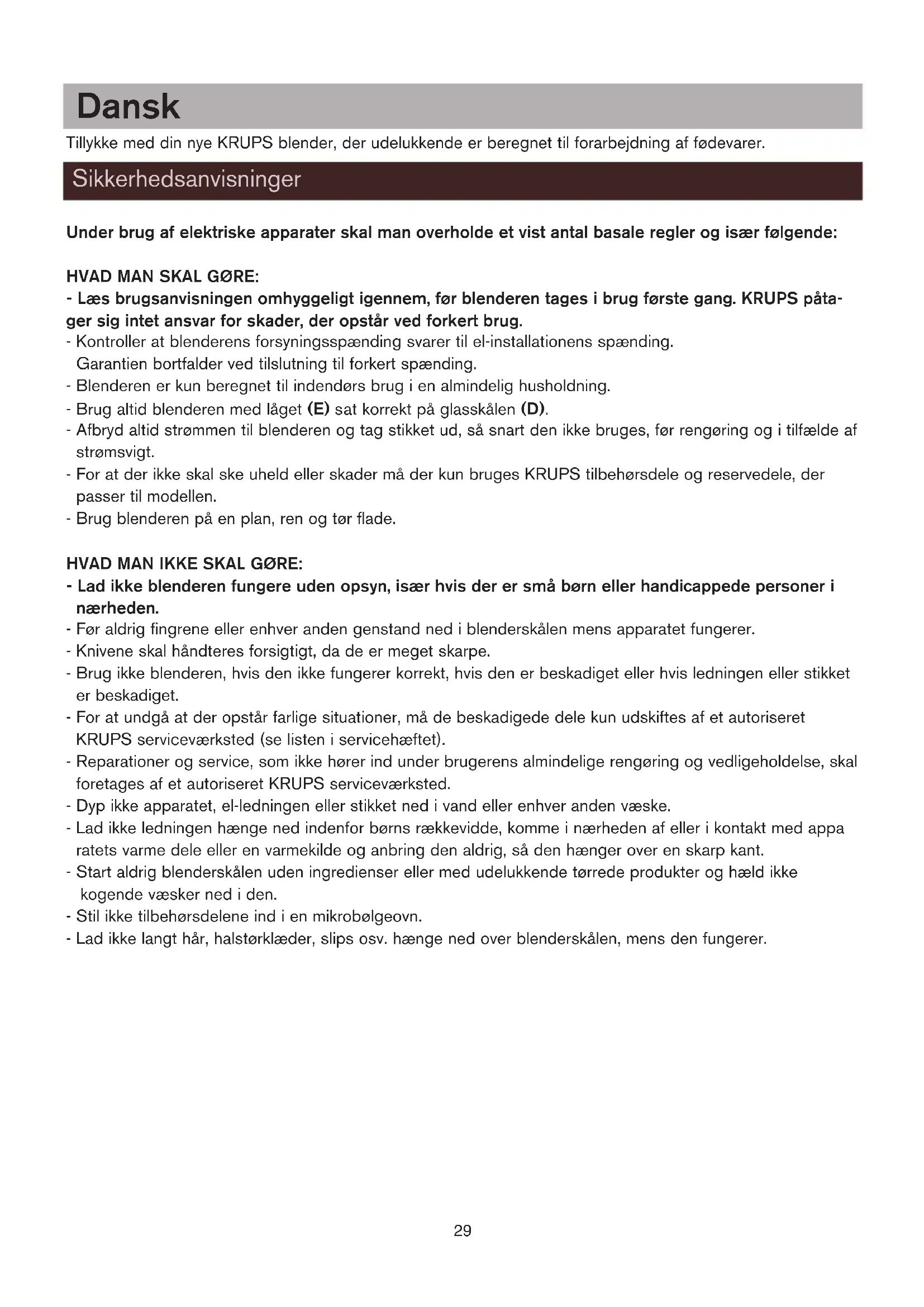 1 o 2 3 o 4 5 s Vari-Pulse 30 s Vari-Pulse Vari-Pulse Limpieza Si la batidora no funciona, ¿qué hacer? Reciclaje ¡ ¡ Participe en la conservación del medio ambiente ! ! Su electrodoméstico contiene materiales recuperables y/o reciclables. Entréguelo al final de su vida útil, en un Centro de Recogida Específico o en uno de nuestros Servicios Oficiales Post Venta donde será tratado de forma adecuada notice* 6/04/06 14:27 Page 2829 Tillykke med din nye KRUPS blender, der udelukkende er beregnet til forarbejdning af fødevarer. Under brug af elektriske apparater skal man overholde et vist antal basale regler og især følgende: HVAD MAN SKAL GØRE: - Læs brugsanvisningen omhyggeligt igennem, før blenderen tages i brug første gang. KRUPS påta- ger sig intet ansvar for skader, der opstår ved forkert brug. - Kontroller at blenderens forsyningsspænding svarer til el-installationens spænding. Garantien bortfalder ved tilslutning til forkert spænding. - Blenderen er kun beregnet til indendørs brug i en almindelig husholdning. - Brug altid blenderen med låget (E) sat korrekt på glasskålen (D). - Afbryd altid strømmen til blenderen og tag stikket ud, så snart den ikke bruges, før rengøring og i tilfælde af strømsvigt. - For at der ikke skal ske uheld eller skader må der kun bruges KRUPS tilbehørsdele og reservedele, der passer til modellen. - Brug blenderen på en plan, ren og tør flade. HVAD MAN IKKE SKAL GØRE: - Lad ikke blenderen fungere uden opsyn, især hvis der er små børn eller handicappede personer i nærheden. - Før aldrig fingrene eller enhver anden genstand ned i blenderskålen mens apparatet fungerer. - Knivene skal håndteres forsigtigt, da de er meget skarpe. - Brug ikke blenderen, hvis den ikke fungerer korrekt, hvis den er beskadiget eller hvis ledningen eller stikket er beskadiget. - For at undgå at der opstår farlige situationer, må de beskadigede dele kun udskiftes af et autoriseret KRUPS serviceværksted (se listen i servicehæftet). - Reparationer og service, som ikke hører ind under brugerens almindelige rengøring og vedligeholdelse, skal foretages af et autoriseret KRUPS serviceværksted. - Dyp ikke apparatet, el-ledningen eller stikket ned i vand eller enhver anden væske. - Lad ikke ledningen hænge ned indenfor børns rækkevidde, komme i nærheden af eller i kontakt med appa ratets varme dele eller en varmekilde og anbring den aldrig, så den hænger over en skarp kant. - Start aldrig blenderskålen uden ingredienser eller med udelukkende tørrede produkter og hæld ikke kogende væsker ned i den. - Stil ikke tilbehørsdelene ind i en mikrobølgeovn. - Lad ikke langt hår, halstørklæder, slips osv. hænge ned over blenderskålen, mens den fungerer. Dansk Sikkerhedsanvisninger notice* 6/04/06 14:27 Page 2930 A Base i metal B Betjeningspanel til valg af hastighed b1 – stopknap b2 – Slow hastighed (langsom hastighed) b3 – hastighed 1 b4 – hastighed 2 b5 – hastighed 3 b6 – hastighed 4 b7 – Ice Crush funktion (knusning af is) b8 – Vari-Pulse funktion C Hulrum til opbevaring af ledning D Blenderskåludstyr d1Blokeringssokkel d2 Aftagelig knivholder d3 Pakning d4Glasskål med måleangivelse 1,75 l E Låg til blenderskål F Doseringsprop på 75 ml G Kværntilbehør (kan fås i autoriserede serviceværksteder) Vigtigt: Kontroller at blenderskålens låg (E) med doseringsprop (F) er sat korrekt på blenderskålen (D). - Start aldrig apparatet i højeste hastighed. - Hastigheden må kun forøges gradvist. - Blenderskålen eller tilbehørsdelene må ikke tages af, før apparatet er helt standset. - For større brugervenlighed eller under opbevaring kan ledningens længde tilpasses ved at skubbe den ind i basen i metal (A) gennem åbningen (C) bag på apparatet (skema 1). - Vask blenderskålen, låget, doseringsproppen og kværntilbehøret i varmt sæbevand før første ibrugtagning. Skyl delene og tør dem omhyggeligt af.