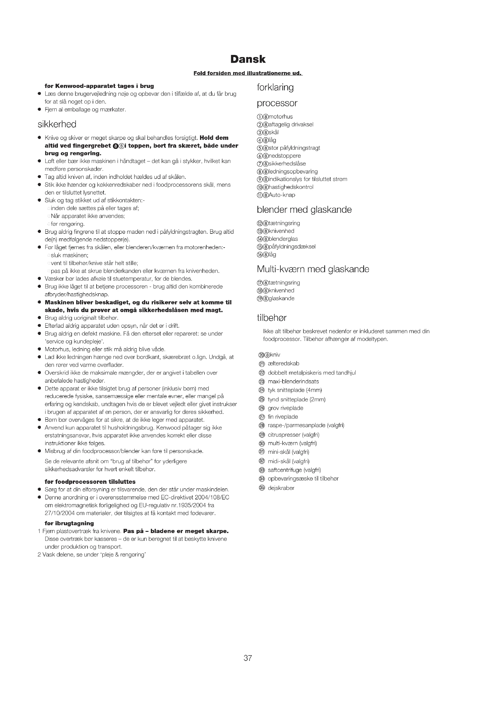 Denne anordning er i overensstemmelse med EC-direktivet 2004/108/EC om elektromagnetisk forligelighed og EU-regulativ nr.1935/2004 fra 27/10/2004 om materialer, der tilsigtes at få kontakt med fødevarer. før ibrugtagning 1 Fjern plastovertræk fra knivene. Pas på – bladene er meget skarpe. Disse overtræk bør kasseres – de er kun beregnet til at beskytte knivene under produktion og transport. 2 Vask delene, se under ‘pleje & rengøring’ forklaring processor motorhus aftagelig drivaksel skål låg stor påfyldningstragt nedstoppere sikkerhedslåse ledningsopbevaring ! indikationslys for tilsluttet strøm " hastighedskontrol # Auto-knap blender med glaskande $ tætningsring % knivenhed & blenderglas ' påfyldningsdæksel ( låg Multi-kværn med glaskande ) tætningsring