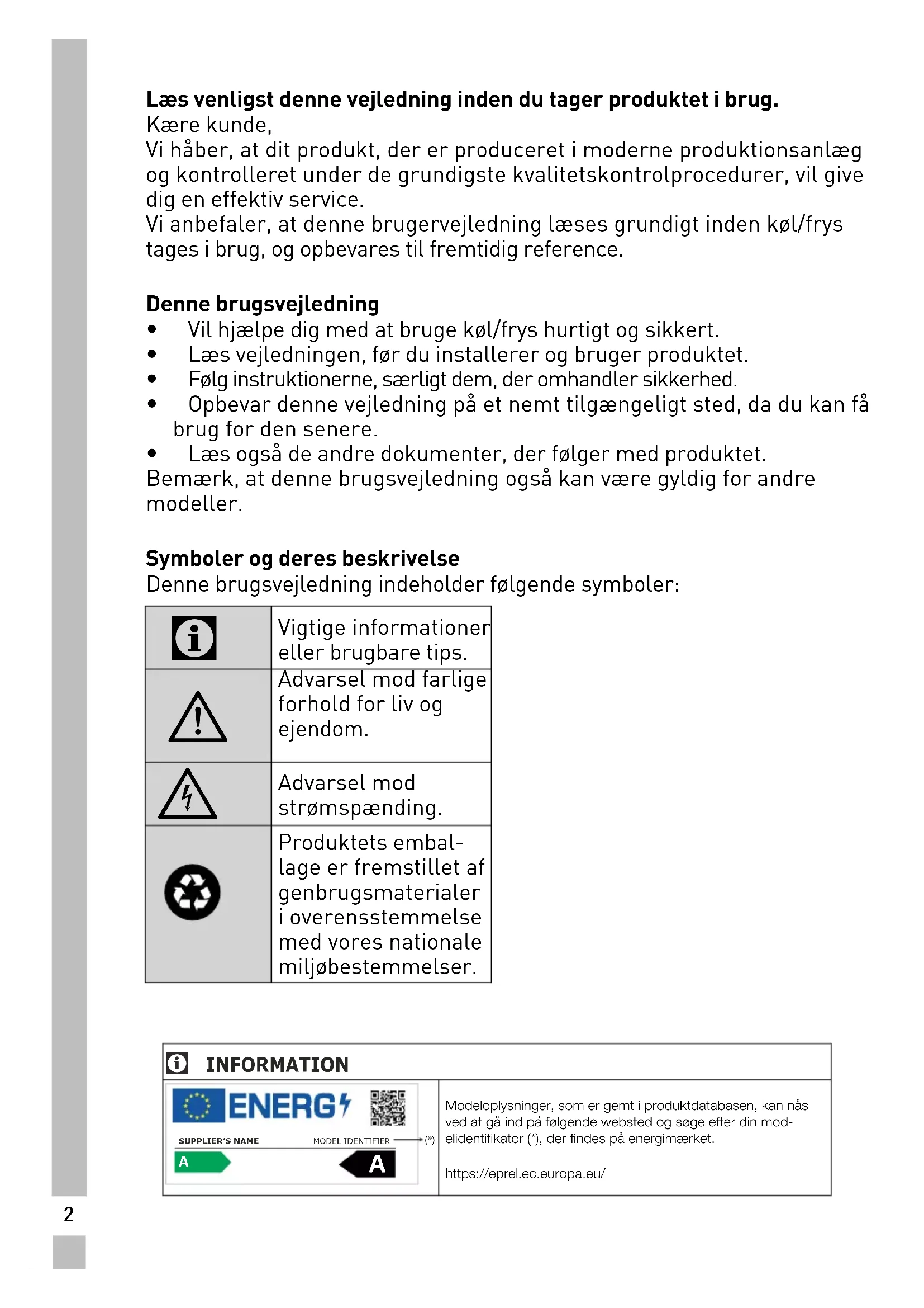 Læs venligst denne vejledning inden du tager produktet i brug. Kære kunde, Vi håber, at dit produkt, der er produceret i moderne produktionsanlæg og kontrolleret under de grundigste kvalitetskontrolprocedurer, vil give dig en effektiv service. Vi anbefaler, at denne brugervejledning læses grundigt inden køl/frys tages i brug, og opbevares til fremtidig reference. Denne brugsvejledning