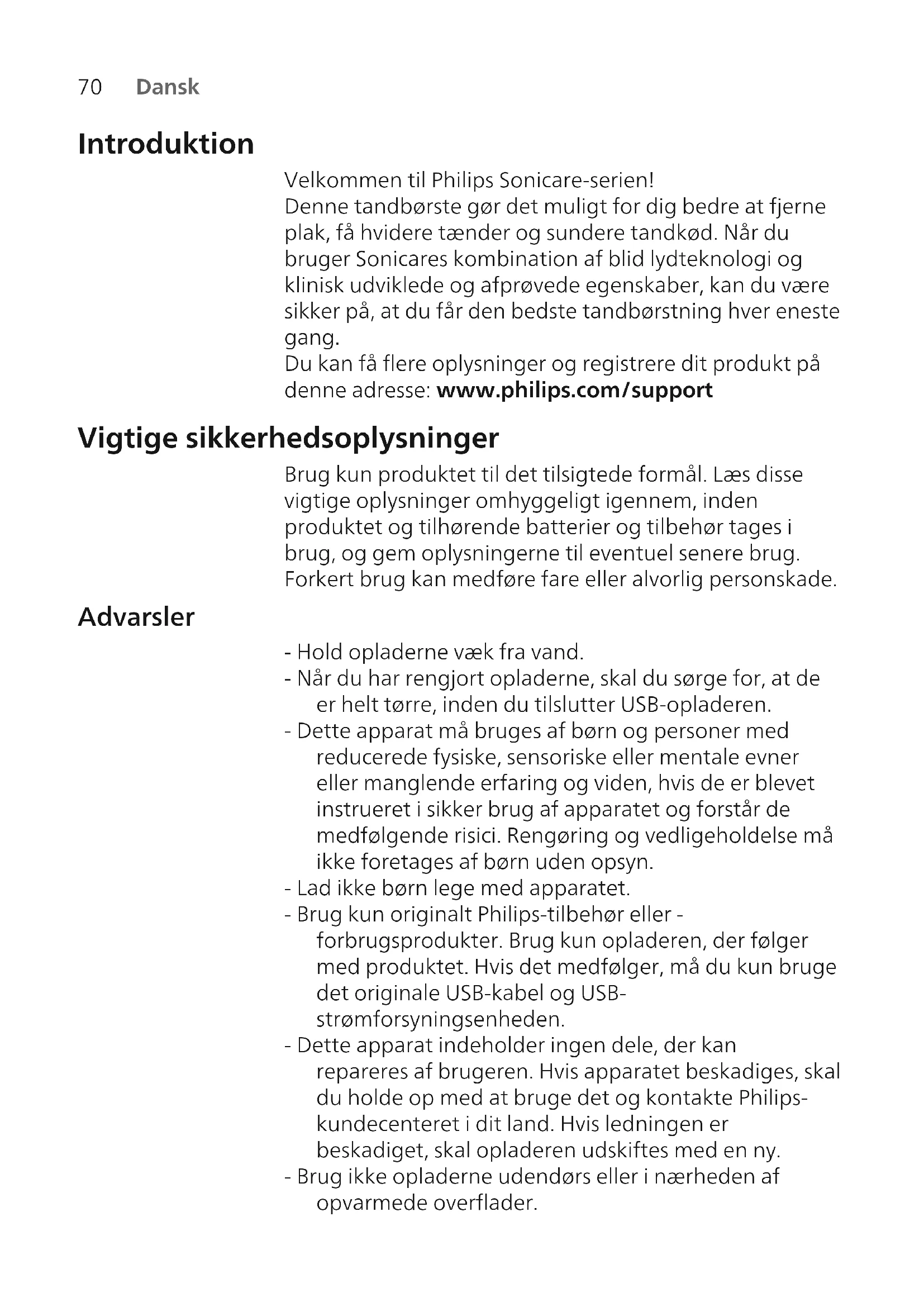 Dansk Introduktion Velkommen til Philips Sonicare-serien! Denne tandbørste gør det muligt for dig bedre at fjerne plak, få hvidere tænder og sundere tandkød. Når du bruger Sonicares kombination af blid lydteknologi og klinisk udviklede og afprøvede egenskaber, kan du være sikker på, at du får den bedste tandbørstning hver eneste gang. Du kan få flere oplysninger og registrere dit produkt på denne adresse: www.philips.com/support Vigtige sikkerhedsoplysninger Brug kun produktet til det tilsigtede formål. Læs disse vigtige oplysninger omhyggeligt igennem, inden produktet og tilhørende batterier og tilbehør tages i brug, og gem oplysningerne til eventuel senere brug. Forkert brug kan medføre fare eller alvorlig personskade. Advarsler - Hold opladerne væk fra vand. - Når du har rengjort opladerne, skal du sørge for, at de er helt tørre, inden du tilslutter USB-opladeren. - Dette apparat må bruges af børn og personer med reducerede fysiske, sensoriske eller mentale evner eller manglende erfaring og viden, hvis de er blevet instrueret i sikker brug af apparatet og forstår de medfølgende risici. Rengøring og vedligeholdelse må ikke foretages af børn uden opsyn. - Lad ikke børn lege med apparatet. - Brug kun originalt Philips-tilbehør eller - forbrugsprodukter. Brug kun opladeren, der følger med produktet. Hvis det medfølger, må du kun bruge det originale USB-kabel og USB- strømforsyningsenheden. - Dette apparat indeholder ingen dele, der kan repareres af brugeren. Hvis apparatet beskadiges, skal du holde op med at bruge det og kontakte Philips- kundecenteret i dit land. Hvis ledningen er beskadiget, skal opladeren udskiftes med en ny. - Brug ikke opladerne udendørs eller i nærheden af opvarmede overflader.71 Dansk - Hverken dele eller tilbehør til produktet må kommes i opvaskemaskinen. - Apparatet er kun beregnet til renholdelse af tænder, tandkød og tunge. - Stop med at bruge et børstehoved, der har ødelagte eller bøjede børstehår. Udskift børstehovedet hver 3. måned, eller så snart de første tegn på slitage viser sig. - Undgå direkte kontakt med produkter, der indeholder æteriske olier eller kokosolie. Kontakt kan resultere i, at der falder totter af børsten. - Stop med at bruge apparatet, og kontakt din tandlæge/læge, hvis der opstår kraftig blødning efter brug, hvis blødningen fortsætter efter 1 uges brug, eller hvis du oplever ubehag eller smerter. - Hvis du er blevet opereret i mund eller tandkød inden for de seneste 2 måneder, skal du spørge din tandlæge til råds, før du bruger apparatet. - Hvis du har en pacemaker eller andre implantater, skal du kontakte din læge eller producenten af implantatet inden brug. - Hvis du har helbredsproblemer, skal du spørge din læge til råds, før du begynder at bruge dette apparat. - Dette produkt er beregnet til personlig hjemmebrug og ikke til brug af et større antal patienter på tandlægeklinikker eller institutioner. Sikkerhedsinstruktioner for batterier - Dette apparat indeholder batterier, som kun må fjernes af fagfolk - Brug kun produktet til det tilsigtede formål. Læs disse oplysninger omhyggeligt igennem, inden produktet og tilhørende batterier og tilbehør tages i brug, og gem oplysningerne til eventuel senere brug. Forkert brug kan medføre fare eller alvorlig personskade. Det medfølgende tilbehør kan variere for forskellige produkter. - Brug kun originalt Philips-tilbehør og forbrugsprodukter. Brug kun den aftagelig forsyningsenhed CBAyyyy, TCAxxxx eller WAAxxxx. - Hold produktet og batterierne væk fra ild, og udsæt dem ikke for direkte sollys eller høje temperaturer.72 Dansk - Hvis produktet bliver unormalt varmt eller lugtende, ændrer farve, eller opladningen tager længere end normalt, skal du ophøre med at bruge og oplade produktet og kontakte Philips. - Du må ikke komme produkter og deres batterier i mikroovne eller placere dem på induktionskogeplader. - For at forhindre, at batterierne overophedes eller afgiver giftstoffer eller farlige substanser, må du ikke åbne, ændre eller slå hul på, beskadige eller skille produktet eller batteriet ad. Batterierne må ikke kortsluttes, overoplades eller udsættes for omvendt elektrisk ladning. - Dette apparat indeholder batterier, der ikke kan udskiftes. Når batteriet har nået enden af sin levetid, skal apparatet bortskaffes på korrekt vis. Se afsnittet om genanvendelse. - Hvis batterierne er ødelagt eller lækker, skal du undgå kontakt med hud og øjne. Hvis dette sker, skal du straks skylle grundigt med vand og søge lægehjælp. - Når du håndterer batterier, skal du sørge for, at dine hænder, produktet og batterierne er tørre. - For at undgå en utilsigtet kortslutning af batterierne efter fjernelse, må du ikke lade batteripolerne komme i kontakt med metalgenstande (f.eks. mønter, hårnåle, ringe). Batterierne må ikke pakkes ind i aluminiumsfolie. Sæt tape på batteripolerne, eller læg batterierne i en plastikpose, før du kasserer dem. - Oplad og brug produktet ved en temperatur mellem 0 °C og 40 °C. Opbevarings- og transportbetingelser Temperatur -10°C til 60°C. Elektromagnetiske felter (EMF) Dette Philips-apparat overholder alle branchens gældende standarder og regler angående eksponering for elektromagnetiske felter.73 Dansk Direktiv om radioudstyr Hermed erklærer Philips, at elektriske tandbørster med radioudstyrstype (Bluetooth, NFC) er i overensstemmelse med direktiv 2014/53/EU. - Bluetooth-radiogrænsefladen i relevante produkter har en driftsfrekvens på 2,4 GHz. - Bluetooth-apparatets højeste udgangseffekt er 3 dBm. - NFC-radiogrænsefladen i relevante produkter har en driftsfrekvens på 13,56 MHz. - Den højeste radiofrekvensenergi, der udsendes af produktet, er 30,16dBm. Den fulde tekst af EU-overensstemmelseserklæringen er tilgængelig på den følgende internetadresse: www.philips.com/support Bemærk: Funktionerne kan variere for forskellige modeller. F.eks. er nogle