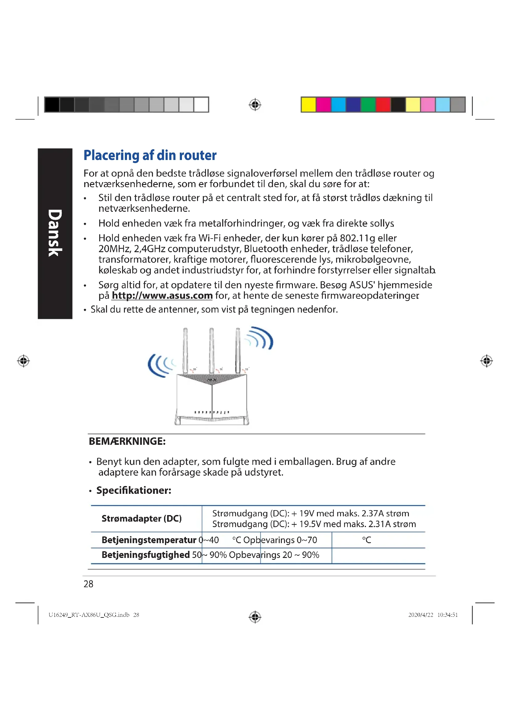 - Uživatelskou příručku najdete na https://www.asus.com/support U16249_RT-AX86U_QSG.indb 26U16249_RT-AX86U_QSG.indb 26 2020/4/22 10:34:482020/4/22 10:34:4827 Dansk Et hurtigt kik på Et hurtigt kik på Pakkens indhold Pakkens indhold RT-AX86U AC adapter Netværkskabel (RJ-45) Kvikstartguide WPS LED Strøm (DC-IN) port LAN 1~4 LED Afbryderknappen WAN (Internet) LED Nulstillingsknap 2.5G LED USB 3.2 Gen 1-porte 2.4GHz LED 2.5G porte 5GHz LED WAN (Internet) porte Strøm LED LAN 1~4 porte WPS LED tænd/sluk-knap WPS knap U16249_RT-AX86U_QSG.indb 27U16249_RT-AX86U_QSG.indb 27 2020/4/22 10:34:512020/4/22 10:34:5128 Dansk Placering af din router Placering af din router For at opnå den bedste trådløse signaloverførsel mellem den trådløse router og netværksenhederne, som er forbundet til den, skal du søre for at: