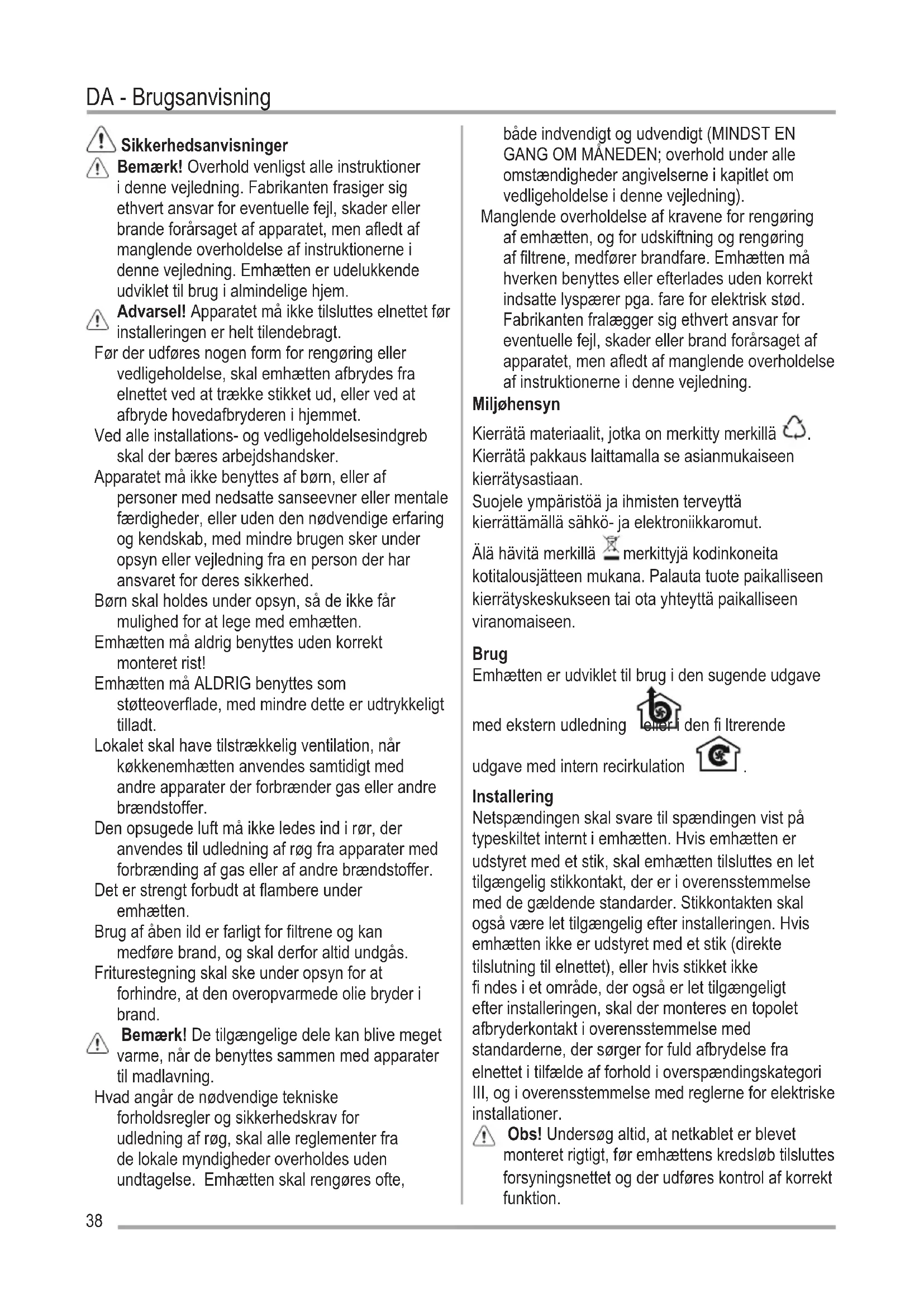 Käytä maksiminopeutta jos keittiössä on erityisen paljon höyryä. On suositeltavaa käynnistää tuuletus 5 minuuttia ennen ruoanlaiton aloittamista ja antaa sen toimia noin 15 minuuttia ruoanlaiton lopettamisesta. Valaistus Irrota laite sähköverkosta. Huomio! Tarkista että lamput eivät ole kuumia ennen kuin kosket niihin. Käytä ainoastaan max 12V -20W – G4 halogeenilamppuja ja varo koskemasta niitä käsin.38 Sikkerhedsanvisninger Bemærk! Overhold venligst alle instruktioner i denne vejledning. Fabrikanten frasiger sig ethvert ansvar for eventuelle fejl, skader eller brande forårsaget af apparatet, men afledt af manglende overholdelse af instruktionerne i denne vejledning. Emhætten er udelukkende udviklet til brug i almindelige hjem. Advarsel! Apparatet må ikke tilsluttes elnettet før installeringen er helt tilendebragt. Før der udføres nogen form for rengøring eller vedligeholdelse, skal emhætten afbrydes fra elnettet ved at trække stikket ud, eller ved at afbryde hovedafbryderen i hjemmet. Ved alle installations- og vedligeholdelsesindgreb skal der bæres arbejdshandsker. Apparatet må ikke benyttes af børn, eller af personer med nedsatte sanseevner eller mentale færdigheder, eller uden den nødvendige erfaring og kendskab, med mindre brugen sker under opsyn eller vejledning fra en person der har ansvaret for deres sikkerhed. Børn skal holdes under opsyn, så de ikke får mulighed for at lege med emhætten. Emhætten må aldrig benyttes uden korrekt monteret rist! Emhætten må ALDRIG benyttes som støtteoverflade, med mindre dette er udtrykkeligt tilladt. Lokalet skal have tilstrækkelig ventilation, når køkkenemhætten anvendes samtidigt med andre apparater der forbrænder gas eller andre brændstoffer. Den opsugede luft må ikke ledes ind i rør, der anvendes til udledning af røg fra apparater med forbrænding af gas eller af andre brændstoffer. Det er strengt forbudt at flambere under emhætten. Brug af åben ild er farligt for filtrene og kan medføre brand, og skal derfor altid undgås. Friturestegning skal ske under opsyn for at forhindre, at den overopvarmede olie bryder i brand. Bemærk! De tilgængelige dele kan blive meget varme, når de benyttes sammen med apparater til madlavning. Hvad angår de nødvendige tekniske forholdsregler og sikkerhedskrav for udledning af røg, skal alle reglementer fra de lokale myndigheder overholdes uden undtagelse. Emhætten skal rengøres ofte, både indvendigt og udvendigt (MINDST EN GANG OM MÅNEDEN; overhold under alle omstændigheder angivelserne i kapitlet om vedligeholdelse i denne vejledning). Manglende overholdelse af kravene for rengøring af emhætten, og for udskiftning og rengøring af filtrene, medfører brandfare. Emhætten må hverken benyttes eller efterlades uden korrekt indsatte lyspærer pga. fare for elektrisk stød. Fabrikanten fralægger sig ethvert ansvar for eventuelle fejl, skader eller brand forårsaget af apparatet, men afledt af manglende overholdelse af instruktionerne i denne vejledning. Miljøhensyn Kierrätä materiaalit, jotka on merkitty merkillä