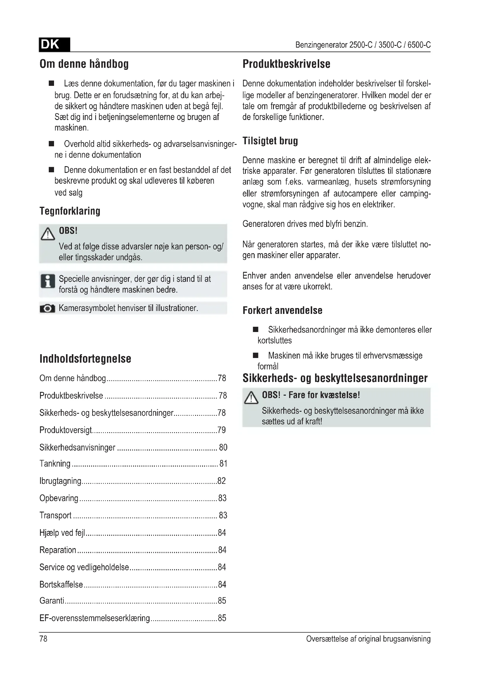 - Benzingenerator 2500-C / 3500-C / 6500-C Indholdsfortegnelse Om denne håndbog p. 78