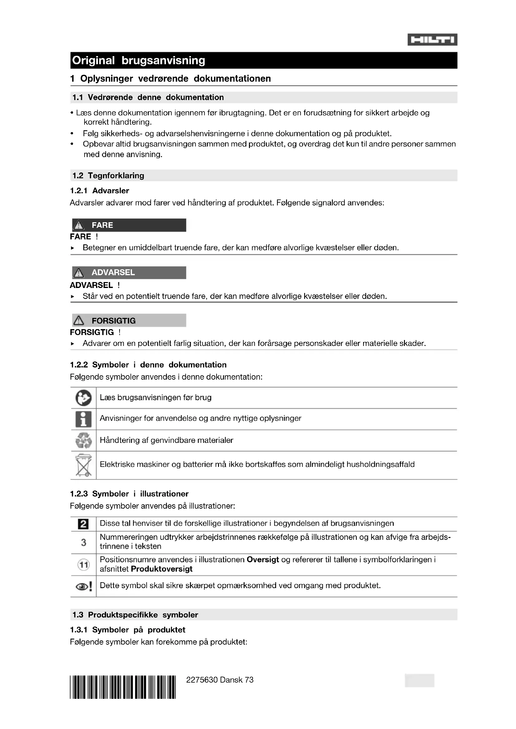 Vi erklærer som eneansvarlige, at det beskrevne produkt er i overensstemmelse med gældende direktiver og standarder. Betingelser: Ikke USA Sidst i dette dokument finder du et bilede af overensstemmelseserklæringen. Den tekniske dokumentation er arkiveret her: Hilti Entwicklungsgesellschaft mbH | Zulassung Geräte | Hiltistraße 6 | 86916 Kaufering, DE 2 Sikkerhed