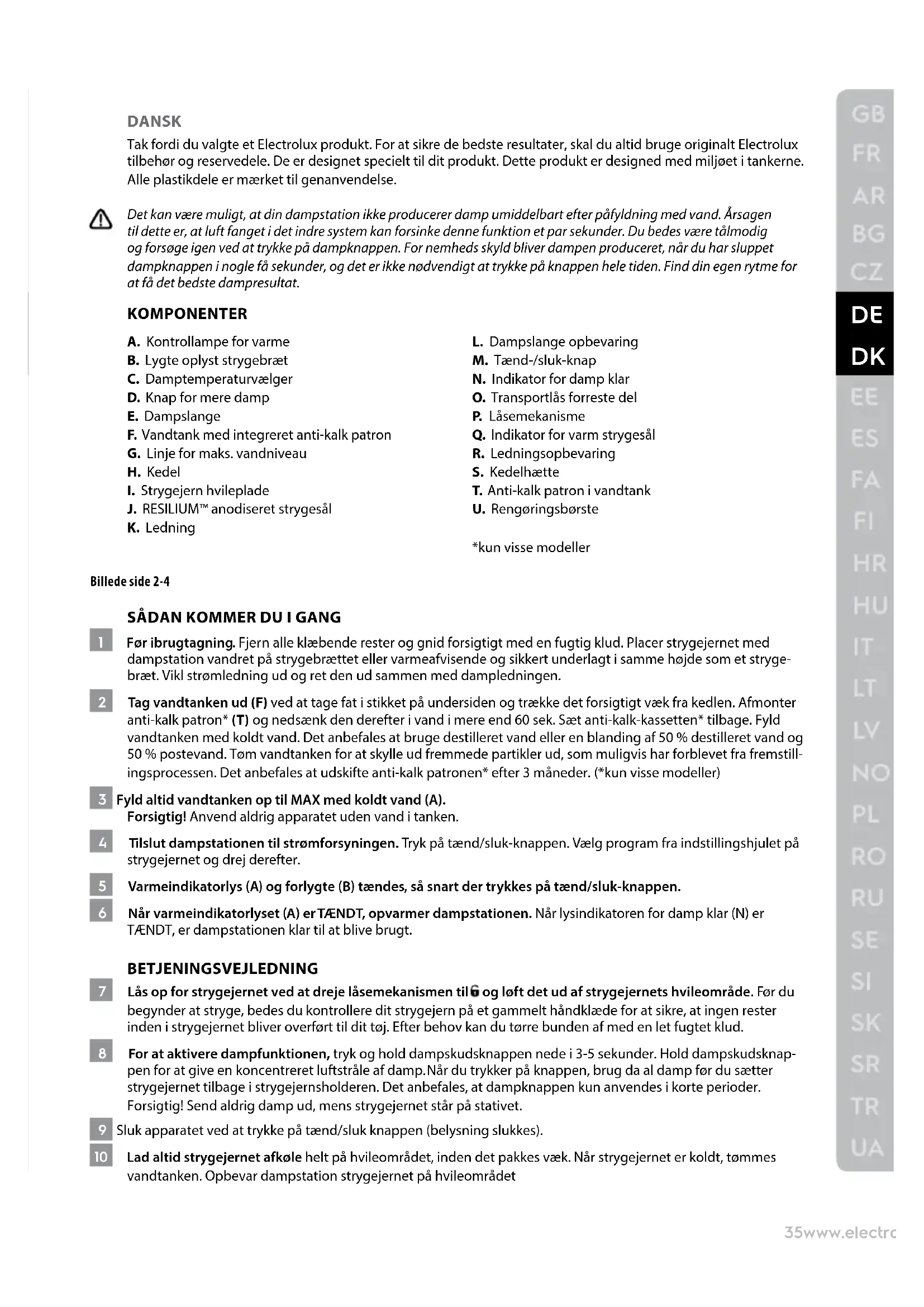 DANSK Tak fordi du valgte et Electrolux produkt. For at sikre de bedste resultater, skal du altid bruge originalt Electrolux tilbehør og reservedele. De er designet specielt til dit produkt. Dette produkt er designed med miljøet i tankerne. Alle plastikdele er mærket til genanvendelse. Det kan være muligt, at din dampstation ikke producerer damp umiddelbart efter påfyldning med vand. Årsagen til dette er, at luft fanget i det indre system kan forsinke denne funktion et par sekunder. Du bedes være tålmodig og forsøge igen ved at trykke på dampknappen. For nemheds skyld bliver dampen produceret, når du har sluppet dampknappen i nogle få sekunder, og det er ikke nødvendigt at trykke på knappen hele tiden. Find din egen rytme for at få det bedste dampresultat. KOMPONENTER A. Kontrollampe for varme B. Lygte oplyst strygebræt C. Damptemperaturvælger D. Knap for mere damp E. Dampslange F. Vandtank med integreret anti-kalk patron G. Linje for maks. vandniveau H. Kedel