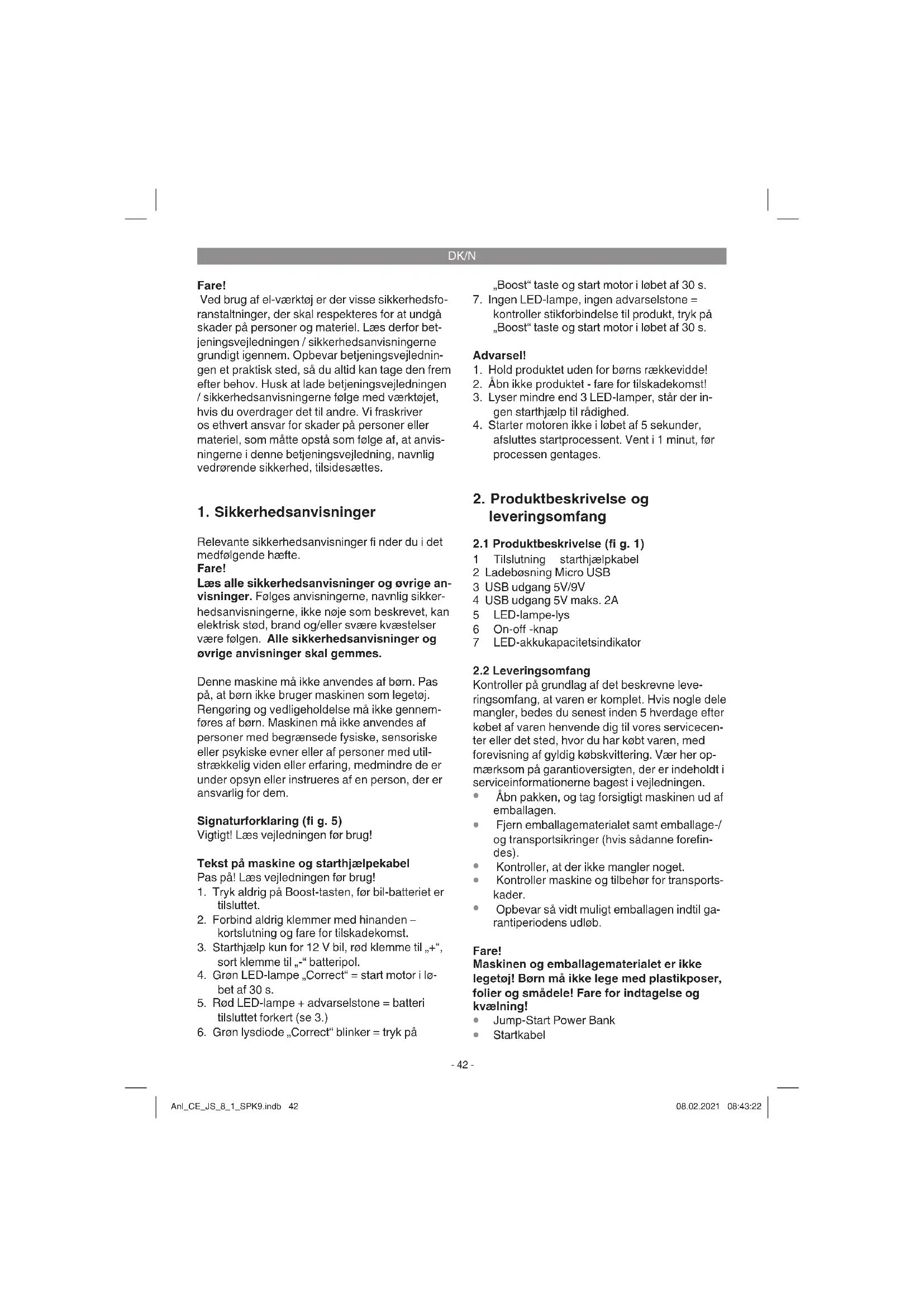 Relevante sikkerhedsanvisninger fi nder du i det medfølgende hæfte. Fare! Læs alle sikkerhedsanvisninger og øvrige an- visninger. Følges anvisningerne, navnlig sikker- hedsanvisningerne, ikke nøje som beskrevet, kan elektrisk stød, brand og/eller svære kvæstelser være følgen. Alle sikkerhedsanvisninger og øvrige anvisninger skal gemmes. Denne maskine må ikke anvendes af børn. Pas på, at børn ikke bruger maskinen som legetøj. Rengøring og vedligeholdelse må ikke gennem- føres af børn. Maskinen må ikke anvendes af personer med begrænsede fysiske, sensoriske eller psykiske evner eller af personer med util- strækkelig viden eller erfaring, medmindre de er under opsyn eller instrueres af en person, der er ansvarlig for dem. Signaturforklaring (fi g. 5) Vigtigt! Læs vejledningen før brug! Tekst på maskine og starthjælpekabel Pas på! Læs vejledningen før brug!