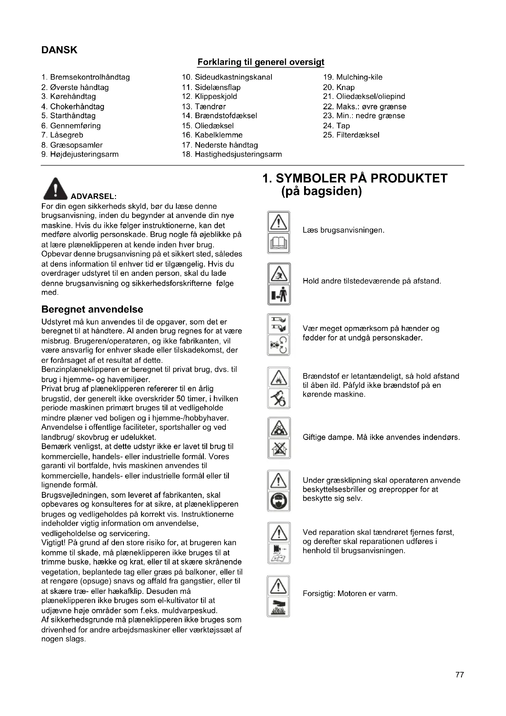 Læs brugsanvisningen. Hold andre tilstedeværende på afstand. Vær meget opmærksom på hænder og fødder for at undgå personskader. Brændstof er letantændeligt, så hold afstand til åben ild. Påfyld ikke brændstof på en kørende maskine. Giftige dampe. Må ikke anvendes indendørs. Under græsklipning skal operatøren anvende beskyttelsesbriller og ørepropper for at beskytte sig selv. Ved reparation skal tændrøret fjernes først, og derefter skal reparationen udføres i henhold til brugsanvisningen. Forsigtig: Motoren er varm.78