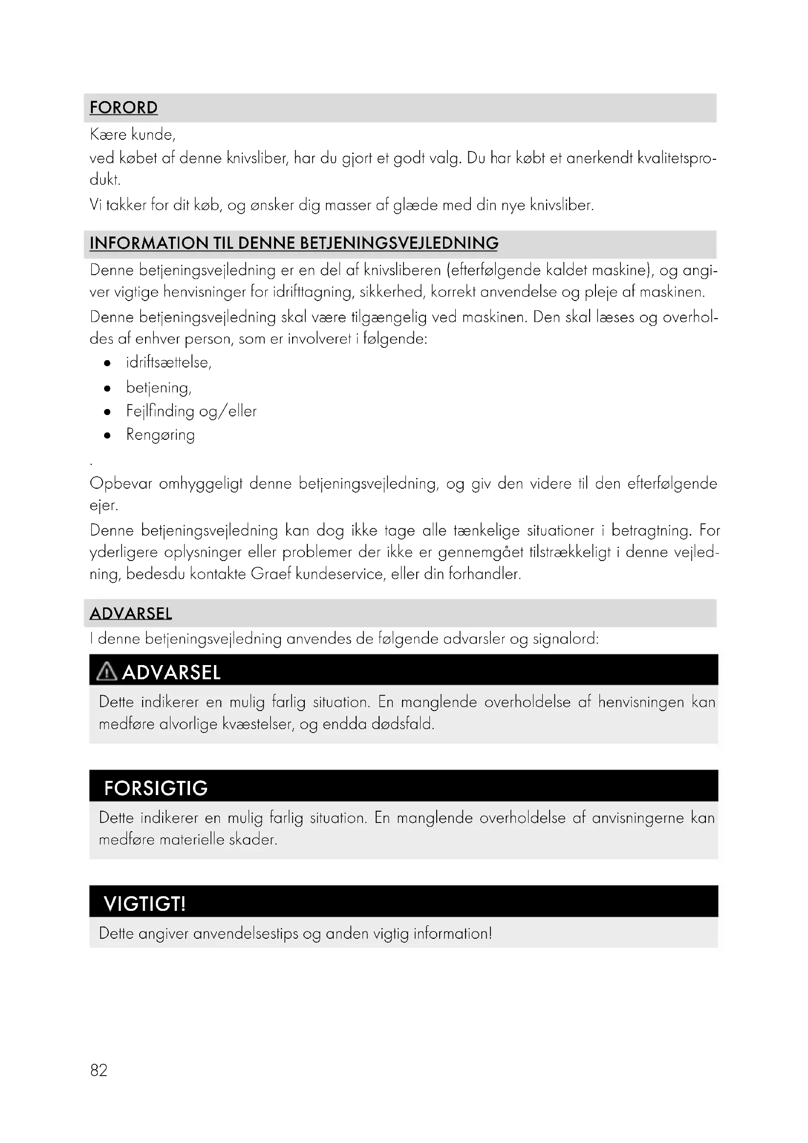 Opbevar omhyggeligt denne betjeningsvejledning, og giv den videre til den efterfølgende ejer. Denne betjeningsvejledning kan dog ikke tage alle tænkelige situationer i betragtning. For yderligere oplysninger eller problemer der ikke er gennemgået tilstrækkeligt i denne vejled- ning, bedesdu kontakte Graef kundeservice, eller din forhandler. ADVARSEL I denne betjeningsvejledning anvendes de følgende advarsler og signalord: ADVARSEL Dette indikerer en mulig farlig situation. En manglende overholdelse af henvisningen kan medføre alvorlige kvæstelser, og endda dødsfald. FORSIGTIG Dette indikerer en mulig farlig situation. En manglende overholdelse af anvisningerne kan medføre materielle skader. VIGTIGT! Dette angiver anvendelsestips og anden vigtig information!83