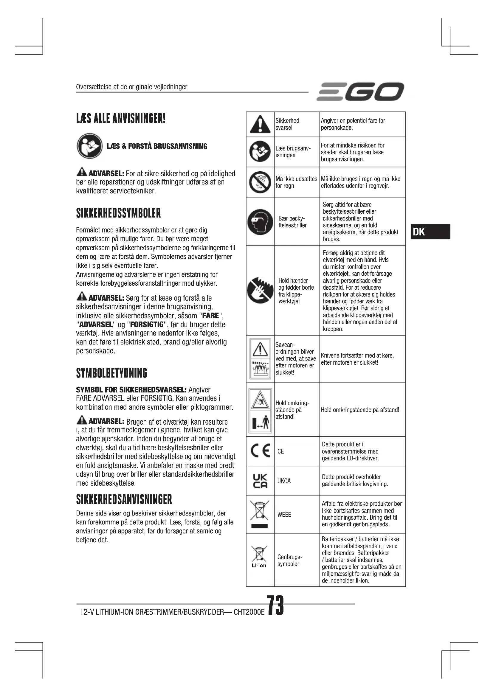 ADVARSEL: For at sikre sikkerhed og pålidelighed bør alle reparationer og udskiftninger udføres af en kvaliceret servicetekniker. SIKKERHEDSSYMBOLER Formålet med sikkerhedssymboler er at gøre dig opmærksom på mulige farer. Du bør være meget opmærksom på sikkerhedssymbolerne og forklaringerne til dem og lære at forstå dem. Symbolernes advarsler fjerner ikke i sig selv eventuelle farer. Anvisningerne og advarslerne er ingen erstatning for korrekte forebyggelsesforanstaltninger mod ulykker. ADVARSEL: Sørg for at læse og forstå alle sikkerhedsanvisninger i denne brugsanvisning, inklusive alle sikkerhedssymboler, såsom "FARE", "ADVARSEL" og "FORSIGTIG", før du bruger dette værktøj. Hvis anvisningerne nedenfor ikke følges, kan det føre til elektrisk stød, brand og/eller alvorlig personskade. SYMBOLBETYDNING SYMBOL FOR SIKKERHEDSVARSEL: Angiver FARE ADVARSEL eller FORSIGTIG. Kan anvendes i kombination med andre symboler eller piktogrammer. ADVARSEL: Brugen af et elværktøj kan resultere i, at du får fremmedlegemer i øjnene, hvilket kan give alvorlige øjenskader. Inden du begynder at bruge et elværktøj, skal du altid bære beskyttelsesbriller eller sikkerhedsbriller med sidebeskyttelse og om nødvendigt en fuld ansigtsmaske. Vi anbefaler en maske med bredt udsyn til brug over briller eller standardsikkerhedsbriller med sidebeskyttelse. SIKKERHEDSANVISNINGER Denne side viser og beskriver sikkerhedssymboler, der kan forekomme på dette produkt. Læs, forstå, og følg alle anvisninger på apparatet, før du forsøger at samle og betjene det. Sikkerhed svarselAngiver en potentiel fare for personskade.Læs brugsanv-isningenFor at mindske risikoen for skader skal brugeren læse brugsanvisningen.Må ikke udsættes for regnMå ikke bruges i regn og må ikke efterlades udenfor i regnvejr.Bær besky-ttelsesbrillerSørg altid for at bære beskyttelsesbriller eller sikkerhedsbriller med sideskærme, og en fuld ansigtsskærm, når dette produkt bruges.Hold hænder og fødder borte fra klippe-værktøjetForsøg aldrig at betjene dit elværktøj med én hånd. Hvis du mister kontrollen over elværktøjet, kan det forårsage alvorlig personskade eller dødsfald. For at reducere risikoen for at skære sig holdes hænder og fødder væk fra klippeværktøjet. Rør aldrig et arbejdende klippeværktøj med hånden eller nogen anden del af kroppen.Savean-ordningen bliver ved med, at save efter motoren er slukket!Knivene fortsætter med at køre, efter motoren er slukket!Hold omkring-stående på afstand!Hold omkringstående på afstand! Dette produkt er i overensstemmelse med gældende EU-direktiver. UKCA Dette produkt overholder gældende britisk lovgivning. WEEE Affald fra elektriske produkter bør ikke bortskaffes sammen med husholdningsaffald. Bring det til en godkendt genbrugsplads. Li-ion Genbrugs- symbolerBatteripakker / batterier må ikke komme i affaldsspanden, i vand eller brændes. Batteripakker / batterier skal indsamles, genbruges eller bortskaffes på en miljømæssigt forsvarlig måde da de indeholder li-ion. Oversættelse af de originale vejledninger12-V LITHIUM-ION GRÆSTRIMMER/BUSKRYDDER— CHT2000E74