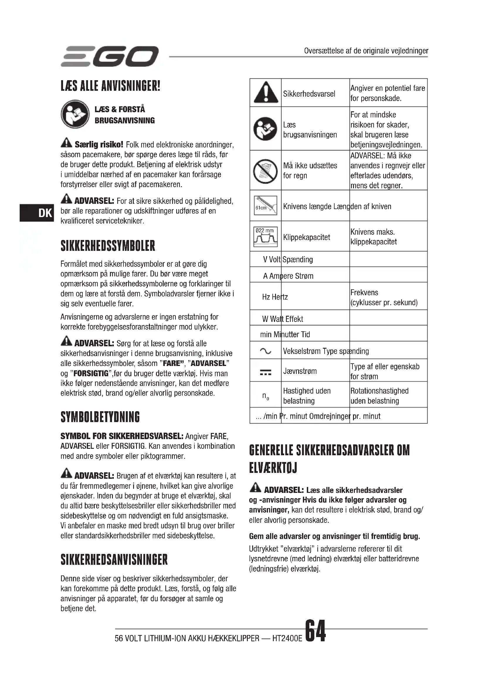 ADVARSEL: Læs alle sikkerhedsadvarsler og -anvisninger Hvis du ikke følger advarsler og anvisninger, kan det resultere i elektrisk stød, brand og/eller alvorlig personskade.Gem alle advarsler og anvisninger til fremtidig brug.Udtrykket ”elværktøj” i advarslerne refererer til dit lysnetdrevne (med ledning) elværktøj eller batteridrevne (ledningsfrie) elværktøj.Oversættelse af de originale vejledninger56 VOLT LITHIUM-ION AKKU HÆKKEKLIPPER — HT2400E