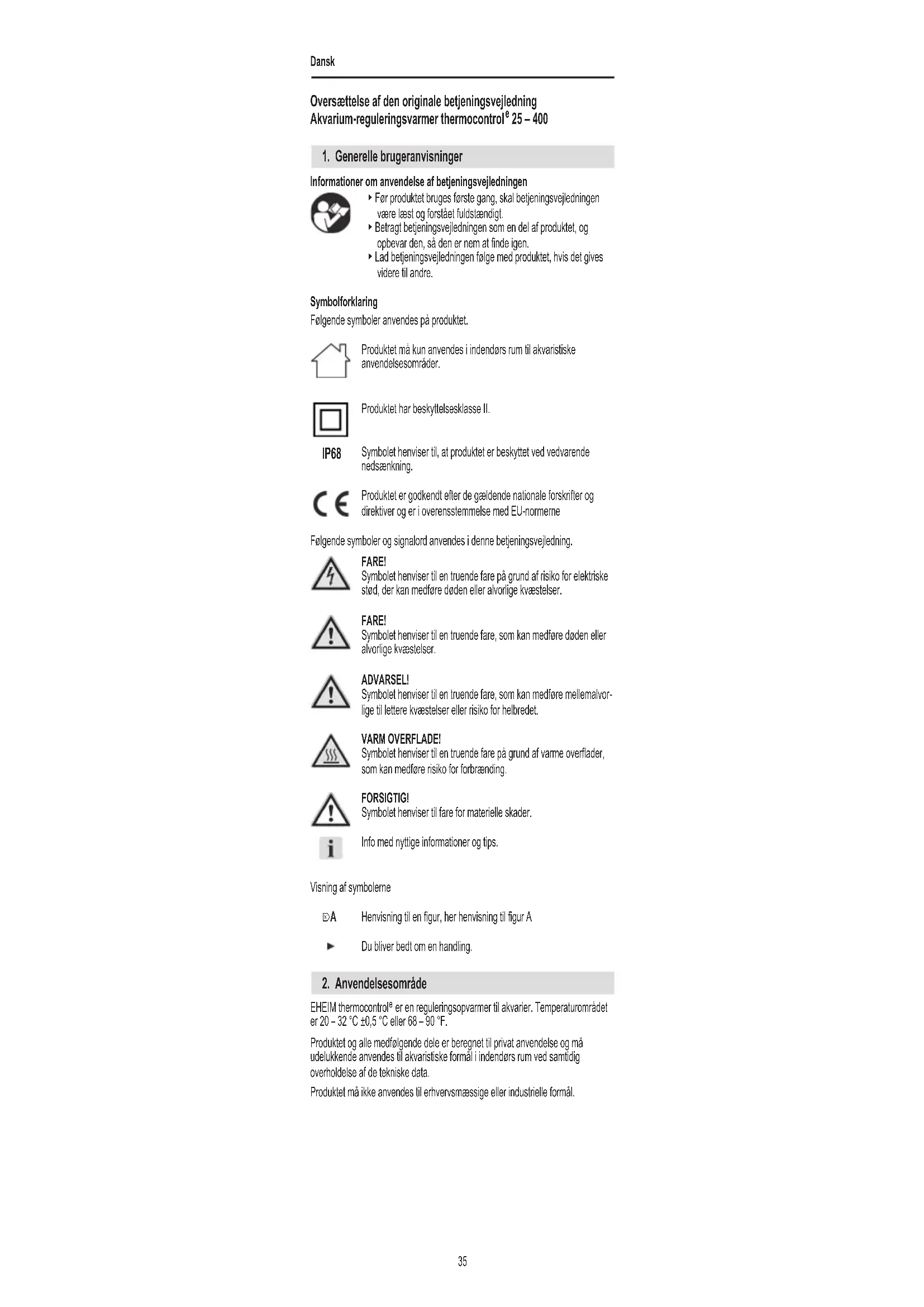er en reguleringsopvarmer til akvarier. Temperaturområdet er 20 – 32 °C ±0,5 °C eller 68 – 90 °F. Produktet og alle medfølgende dele er beregnet til privat anvendelse og må udelukkende anvendes til akvaristiske formål i indendørs rum ved samtidig overholdelse af de tekniske data. Produktet må ikke anvendes til erhvervsmæssige eller industrielle formål. IP68 ⌦ADansk