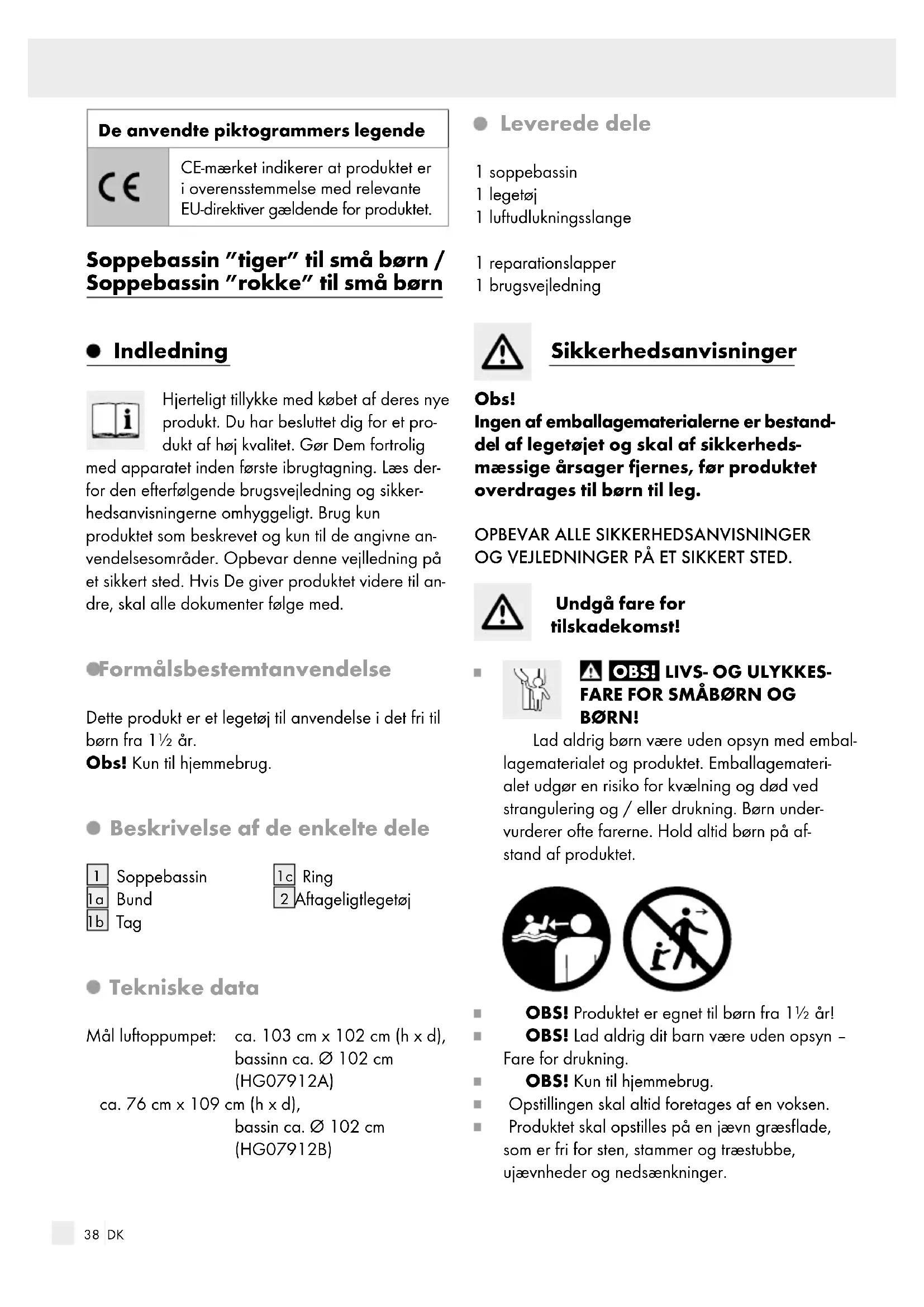 Aftageligt legetøj Tekniske data Mål luftoppumpet: ca. 103 cm x 102 cm (h x d), bassinn ca. Ø 102 cm (HG07912A) ca. 76 cm x 109 cm (h x d), bassin ca. Ø 102 cm (HG07912B) Leverede dele 1 soppebassin 1 legetøj 1 luftudlukningsslange 1 reparationslapper 1 brugsvejledning Sikkerhedsanvisninger Obs! Ingen af emballagematerialerne er bestand-