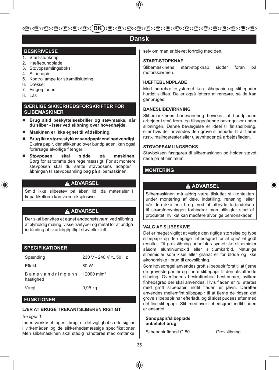 GB FR DE ES IT NL PT DK SE FI NO RU PL CZ HU RO LV LT EE HR SI SK GR TR Dansk maskinen og slibepapiret, der skal gøre "arbejdet". Hvis der trykkes yderligere på maskinen, risikerer motorens hastighed at falde, slibepapiret bliver hurtigere slidt, og slibehastigheden nedsættes betydeligt. Desuden vil for hårdt tryk overbelaste og overophede motoren, så den bliver ødelagt og værktøjets effektivitet forringes. Pas på gnidnings-varmen, som kan blødgøre lak og harpiks på træet.