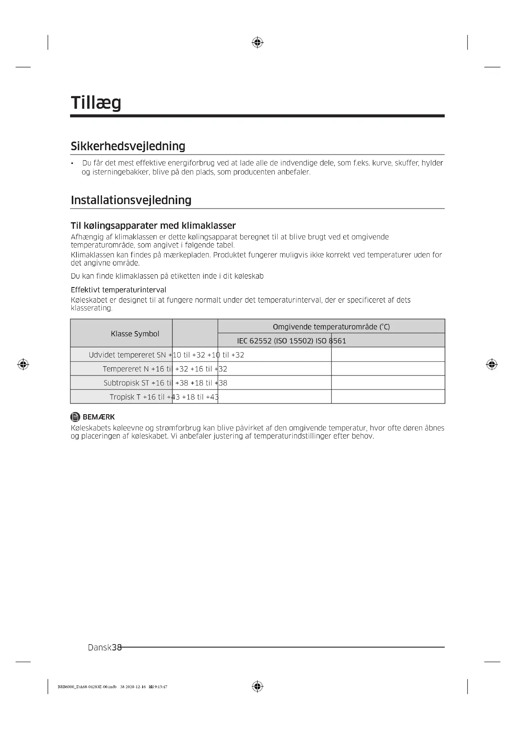 - Du får det mest effektive energiforbrug ved at lade alle de indvendige dele, som f.eks. kurve, skuffer, hylder og isterningebakker, blive på den plads, som producenten anbefaler. Installationsvejledning Til kølingsapparater med klimaklasser Afhængig af klimaklassen er dette kølingsapparat beregnet til at blive brugt ved et omgivende temperaturområde, som angivet i følgende tabel. Klimaklassen kan findes på mærkepladen. Produktet fungerer muligvis ikke korrekt ved temperaturer uden for det angivne område. Du kan finde klimaklassen på etiketten inde i dit køleskab Effektivt temperaturinterval Køleskabet er designet til at fungere normalt under det temperaturinterval, der er specificeret af dets klasserating. Klasse Symbol Omgivende temperaturområde (°C)