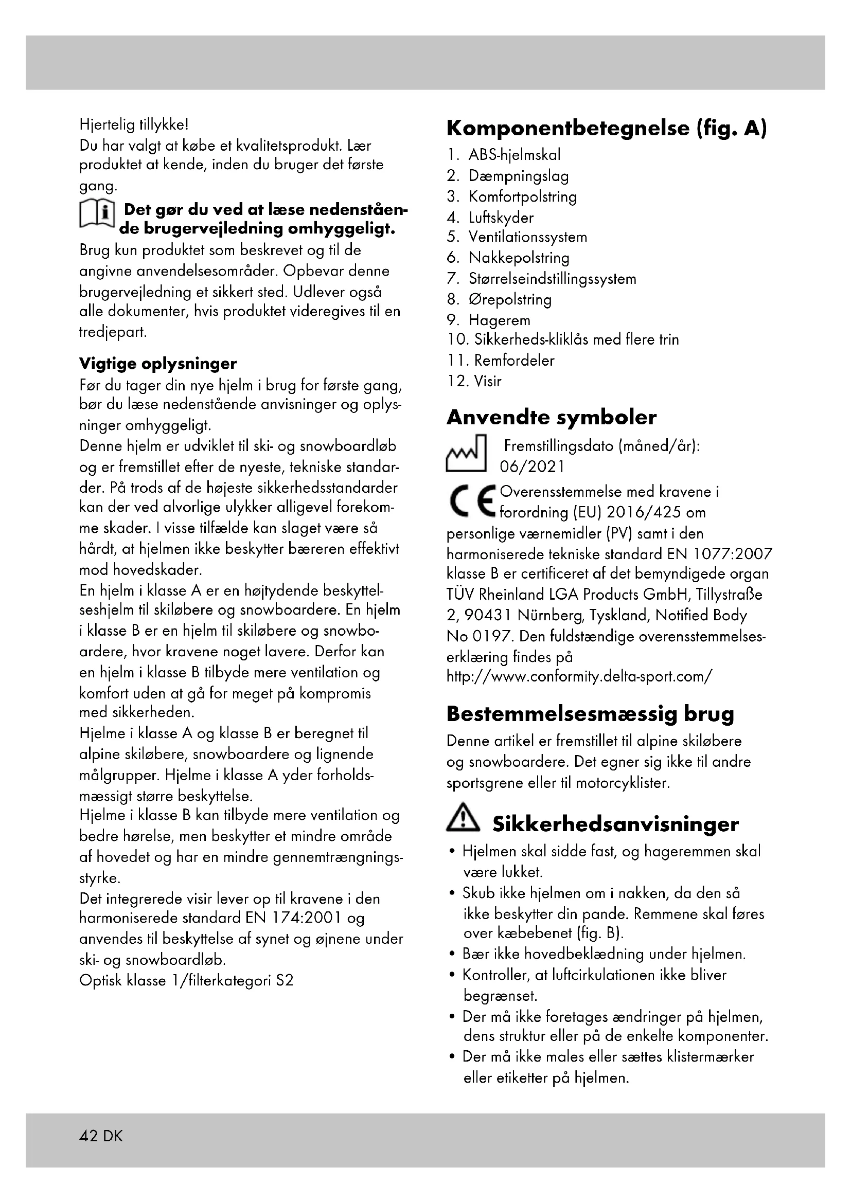 Anvendte symboler Fremstillingsdato (måned/år): 06/2021 Overensstemmelse med kravene i forordning (EU) 2016/425 om personlige værnemidler (PV) samt i den harmoniserede tekniske standard EN 1077:2007 klasse B er certificeret af det bemyndigede organ TÜV Rheinland LGA Products GmbH, Tillystraße 2, 90431 Nürnberg , Tyskland, Notified Body No 0197. Den fuldstændige overensstemmelses- erklæring findes på http://www.conformity.delta-sport.com/ Bestemmelsesmæssig brug Denne artikel er fremstillet til alpine skiløbere og snowboardere. Det egner sig ikke til andre sportsgrene eller til motorcyklister. Sikkerhedsanvisninger