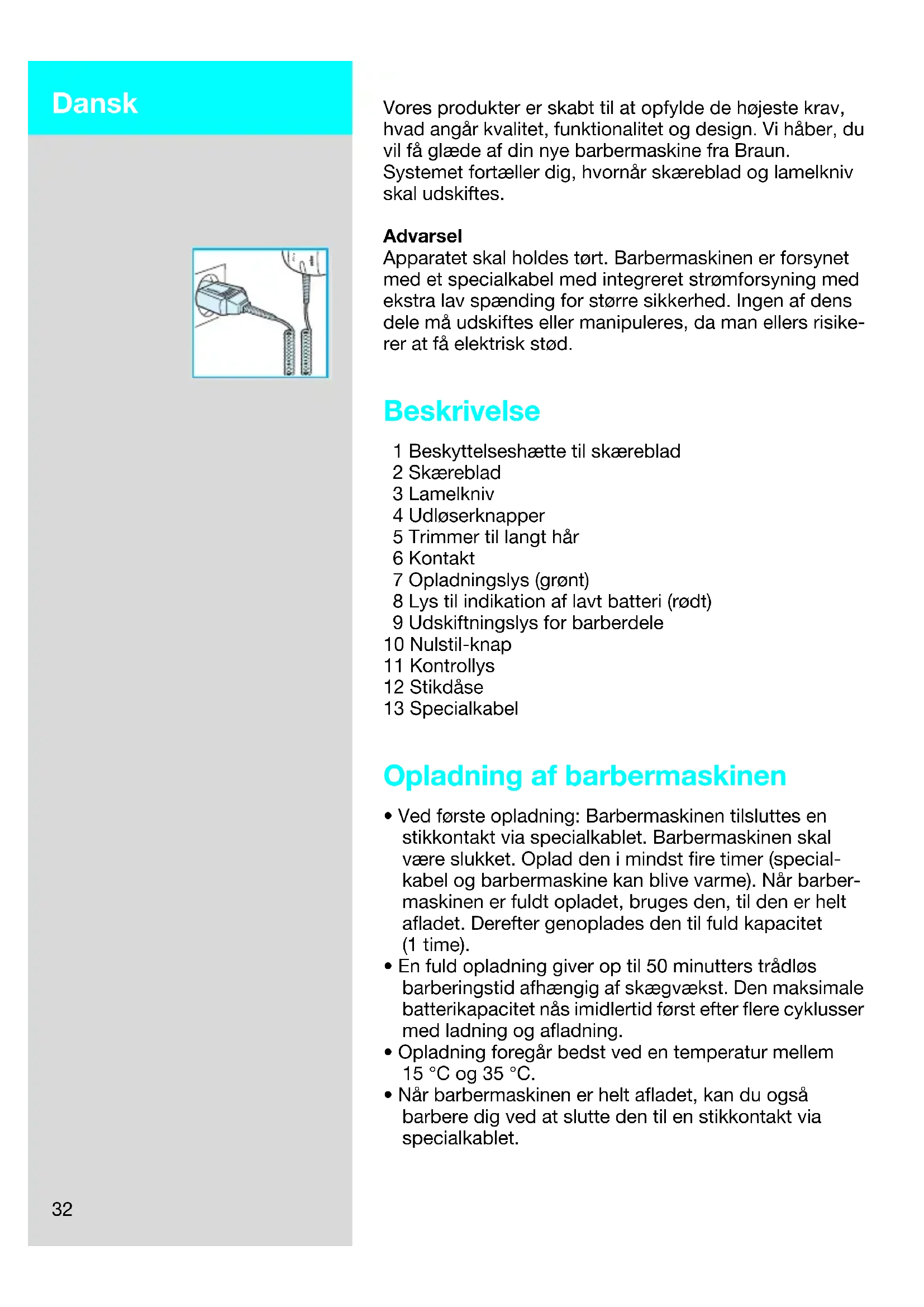- Ved første opladning: Barbermaskinen tilsluttes en stikkontakt via specialkablet. Barbermaskinen skal være slukket. Oplad den i mindst fire timer (special- kabel og barbermaskine kan blive varme). Når barber- maskinen er fuldt opladet, bruges den, til den er helt afladet. Derefter genoplades den til fuld kapacitet (1 time).
