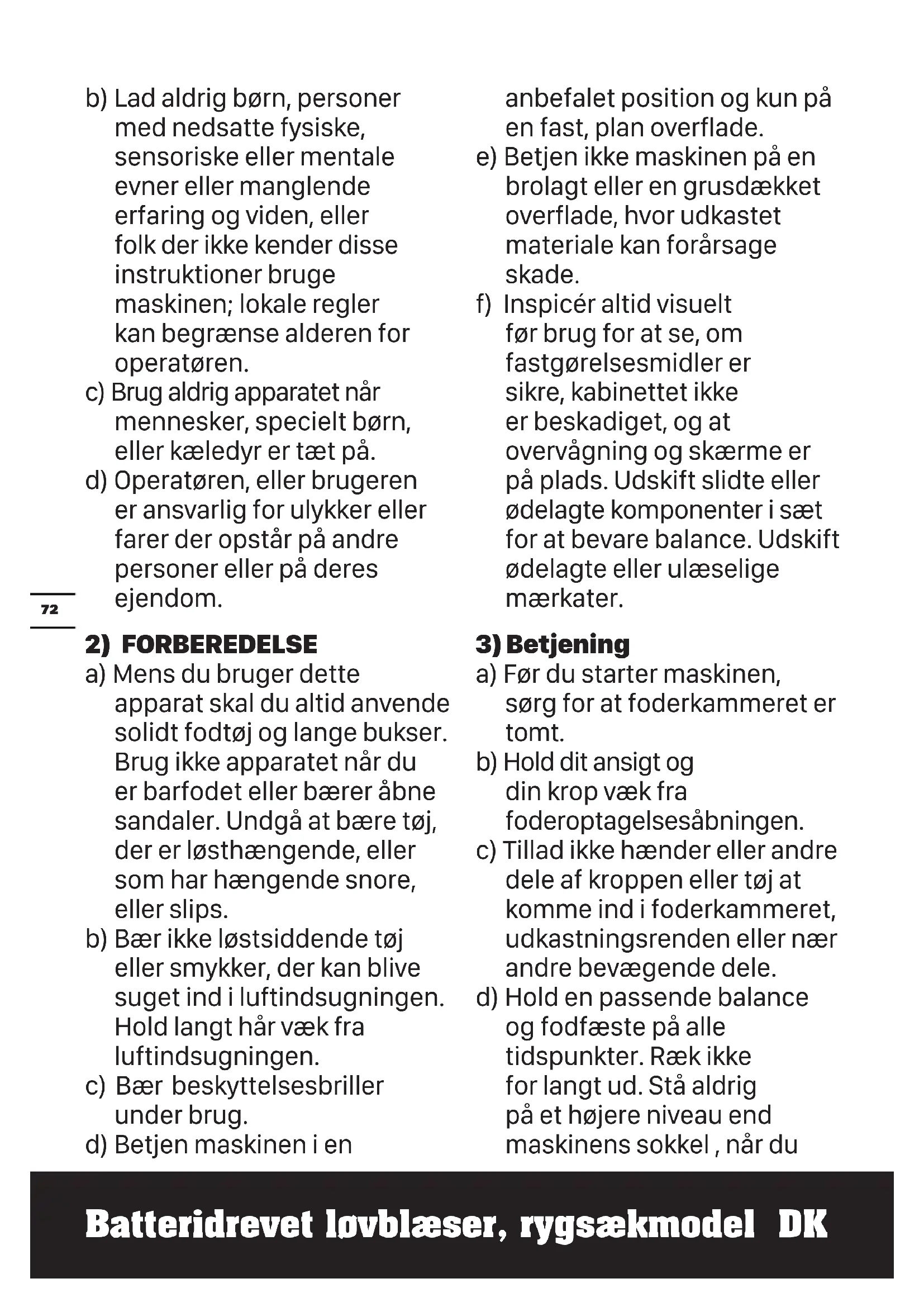 a) Før du starter maskinen, sørg for at foderkammeret er tomt. b) Hold dit ansigt og din krop væk fra foderoptagelsesåbningen. c) Tillad ikke hænder eller andre dele af kroppen eller tøj at komme ind i foderkammeret, udkastningsrenden eller nær andre bevægende dele. d) Hold en passende balance og fodfæste på alle tidspunkter. Ræk ikke for langt ud. Stå aldrig på et højere niveau end maskinens sokkel , når duBatteridrevet løvblæser, rygsækmodel DK